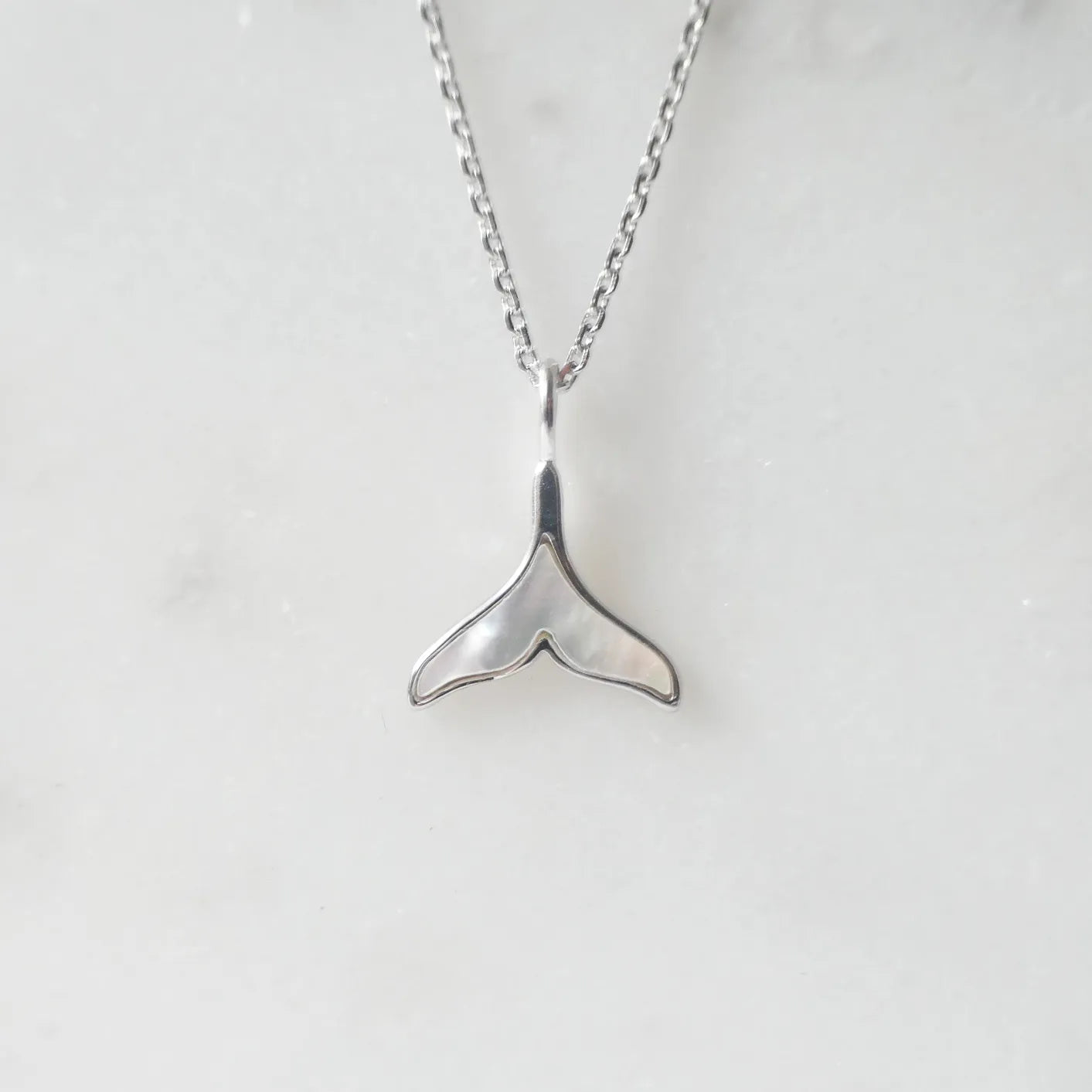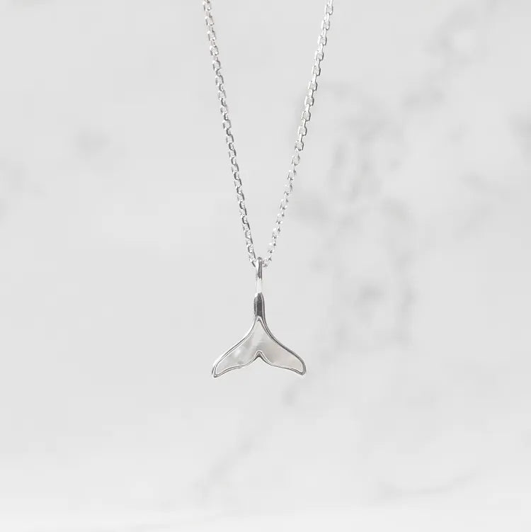 マザーオブパールの柔らかな光沢がクジラテールを引き立てるシルバー925ロジウムプレーティングネックレス。金属アレルギー対応。