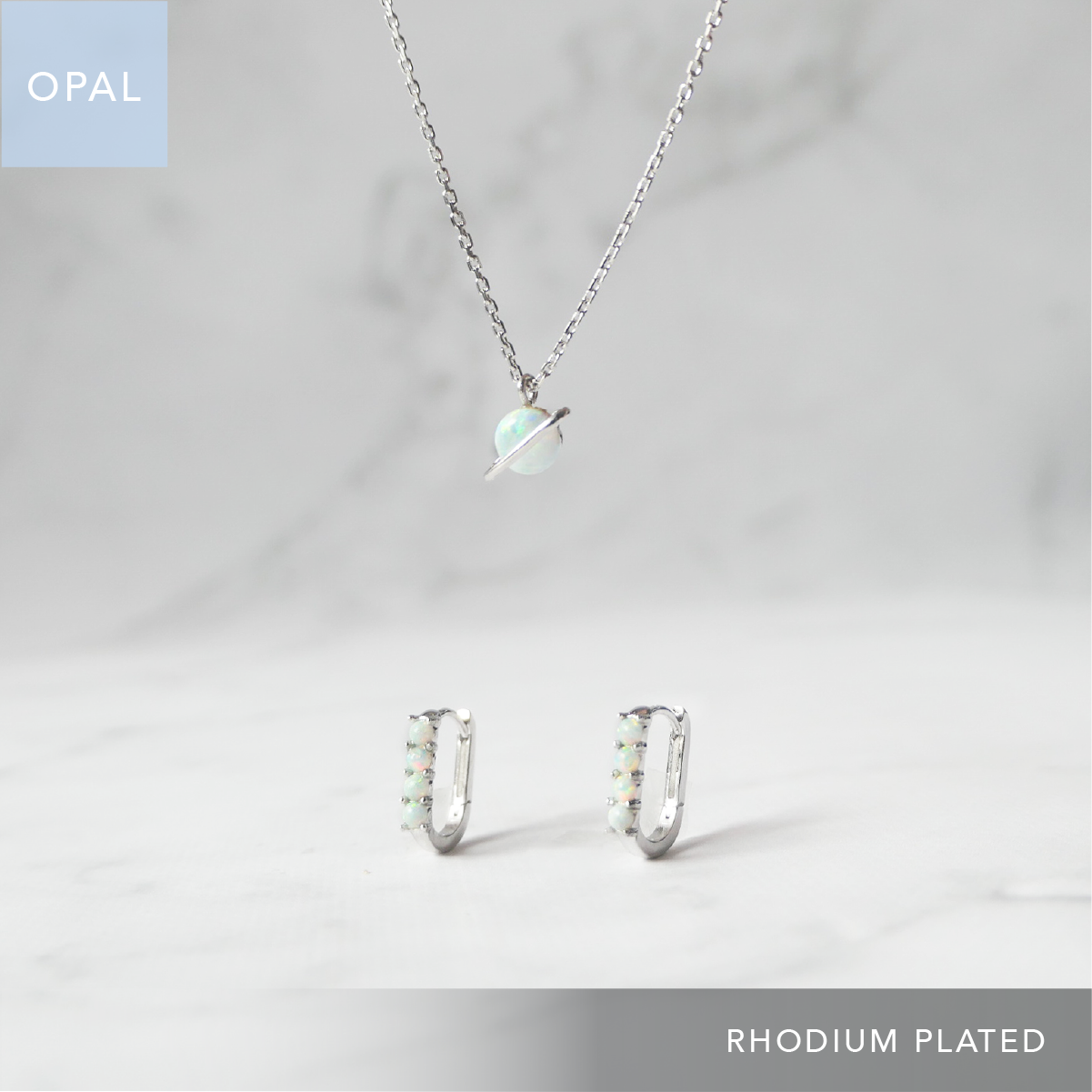 Opal planet motif necklace and huggie earrings set in 925 sterling silver, rhodium plated with iridescent glow and hypoallergenic design.