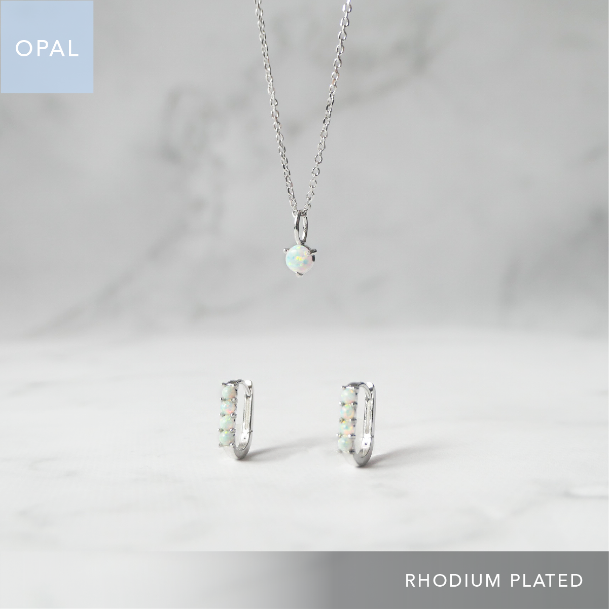 オパールのネックレスとハギーピアス2点セット(シルバー925/ロジウムプレーティング)。虹色の遊色が美しく金属アレルギー対応。Opal necklace and huggie earrings set in 925 sterling silver, rhodium plated with iridescent play-of-color and hypoallergenic finish.