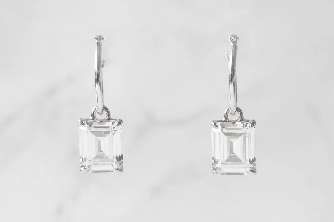 A rectangular step-cut zirconia that reflects light in clean, direct planes — crisp and elegant in a way that rounder cuts are not.