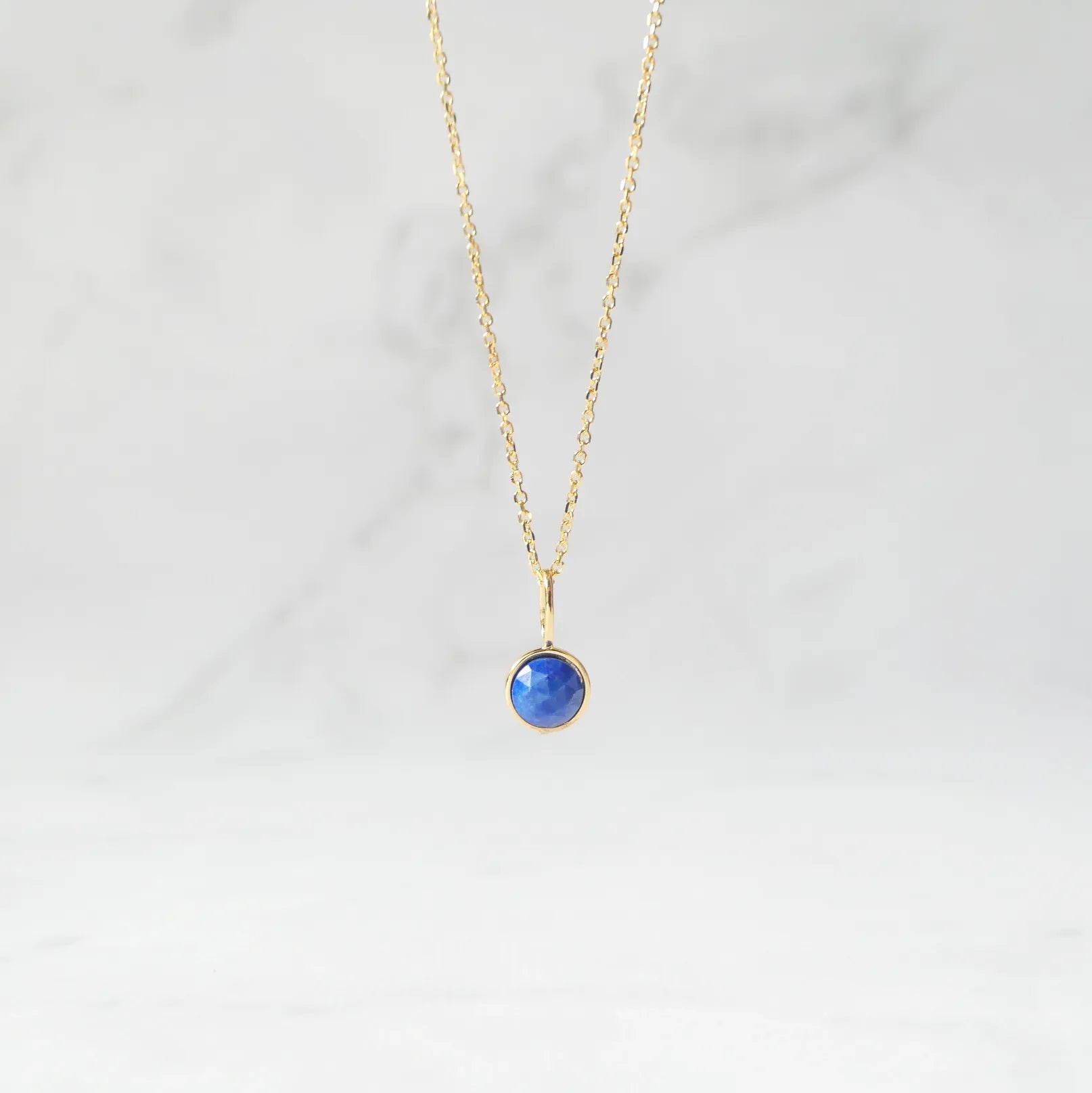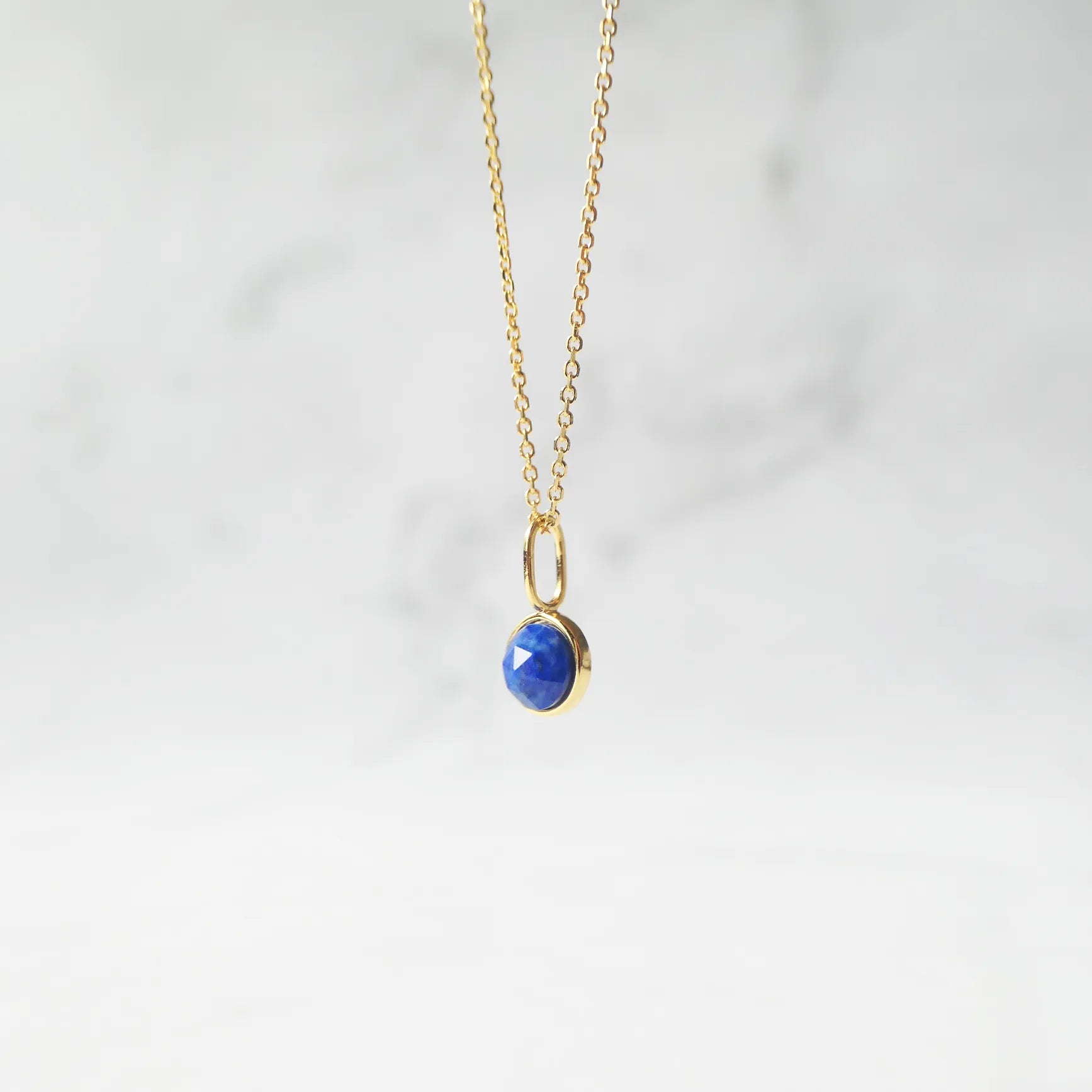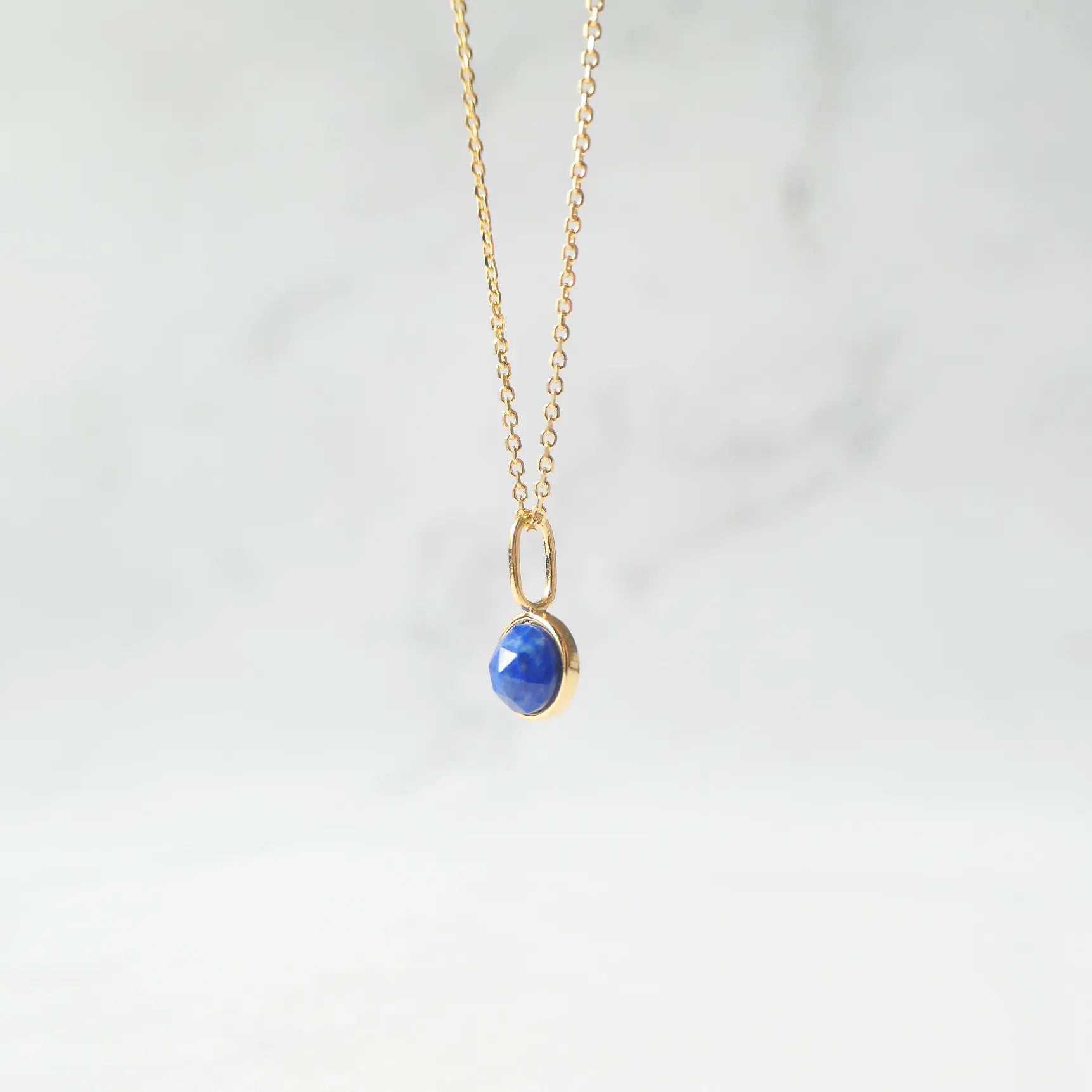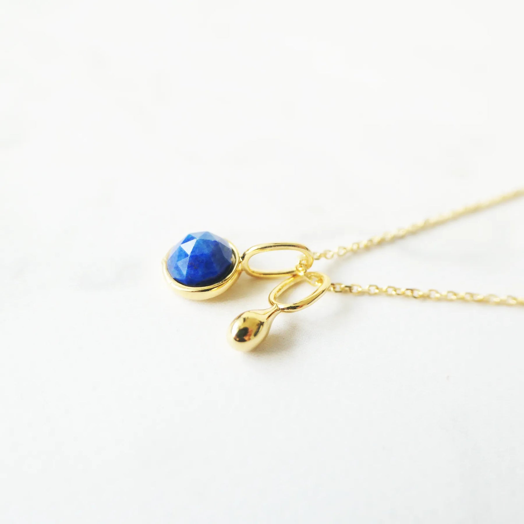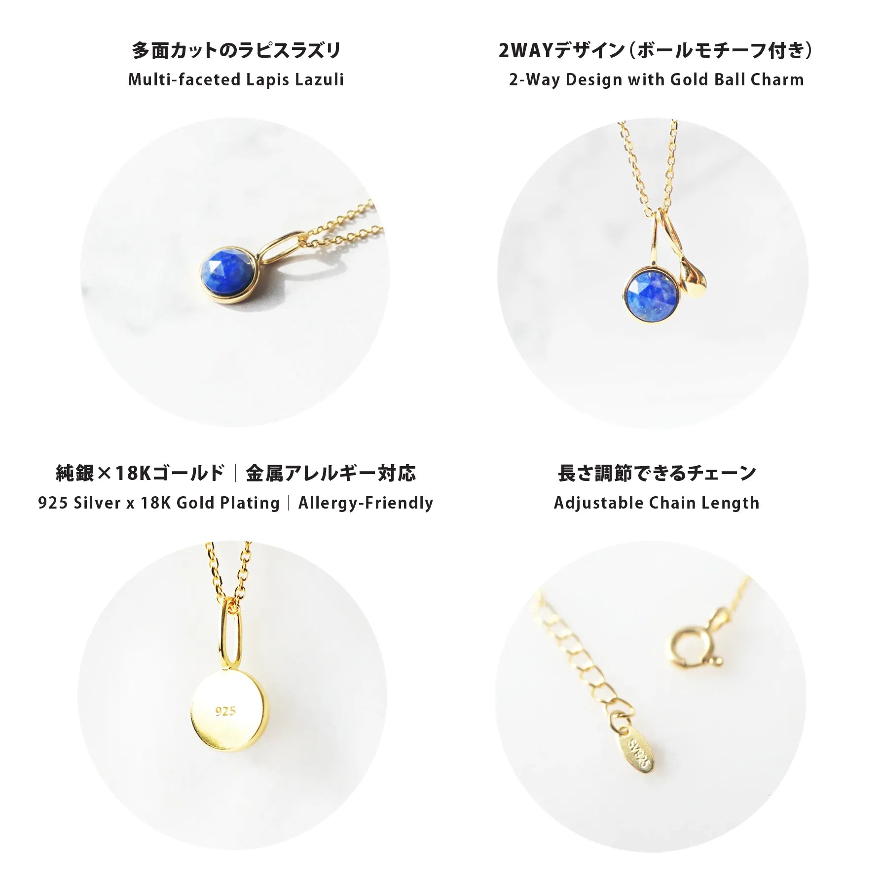 深く澄んだブルーが美しい天然ラピスラズリを、繊細な多面カットで仕上げたネックレス。光を受けるたびに表情を変え、柔らかくも力強い輝きを放ちます。サイドにあしらった小さなゴールドボールが、やわらかな温もりと高級感を添えるアクセントに。ゴールドとラピスブルーの組み合わせは、古くから「王の色」と呼ばれるほどのクラシックな配色。深い青が18Kゴールドの光を引き立て、華やかさと知性を兼ね備えた印象に仕上げます。シンプルにも華やかにも着けられる2WAYデザインです。