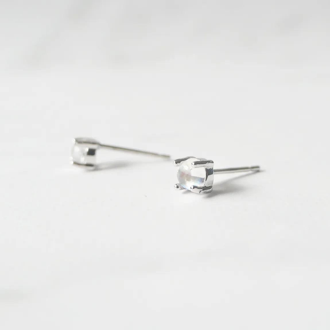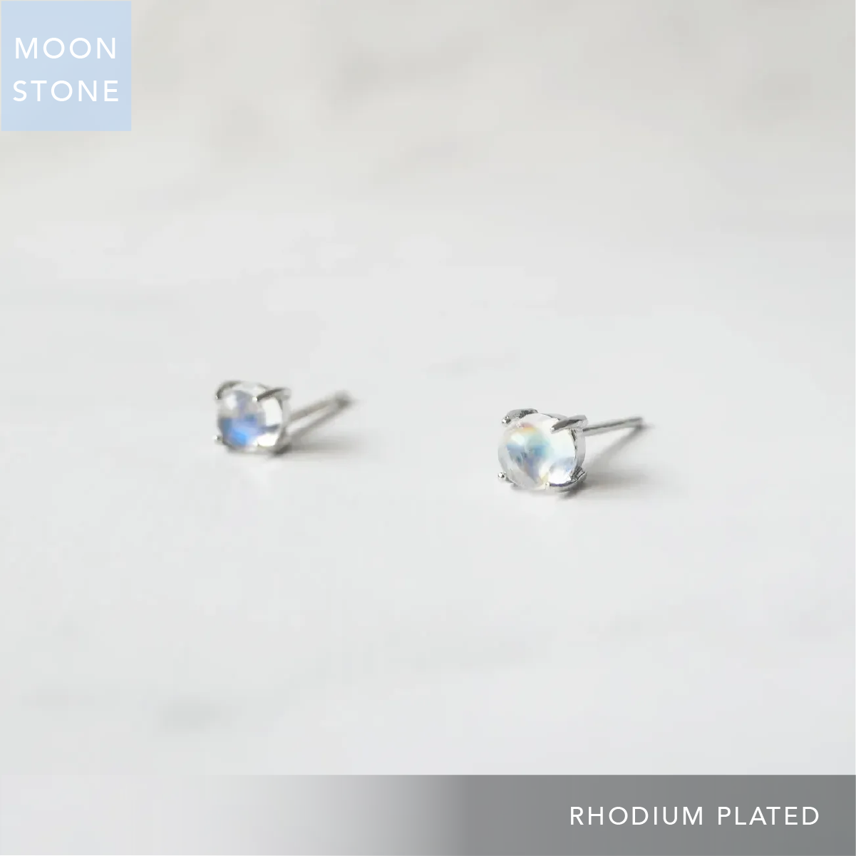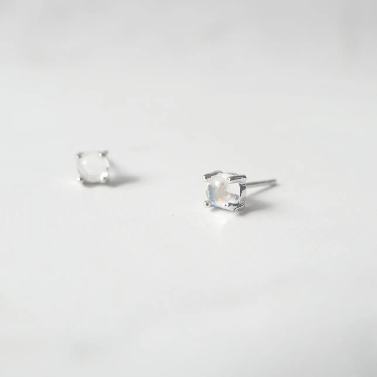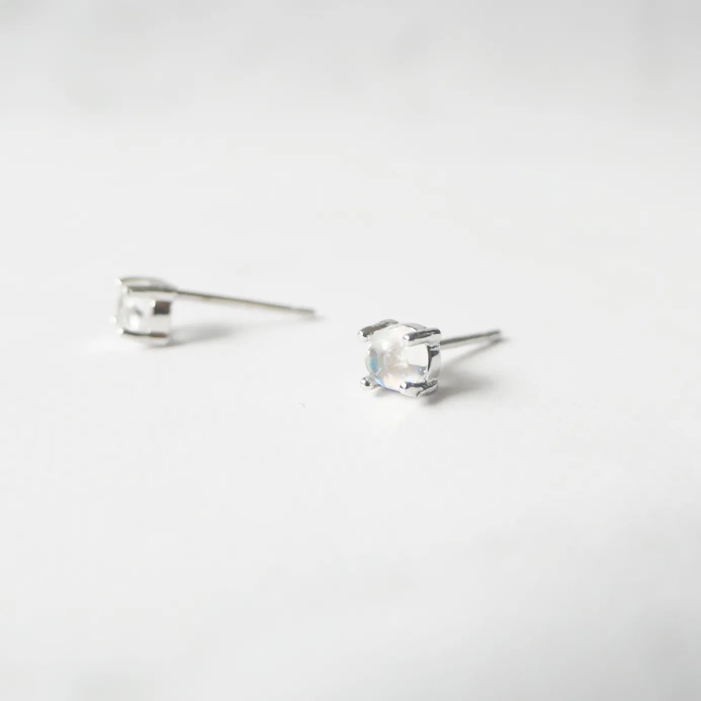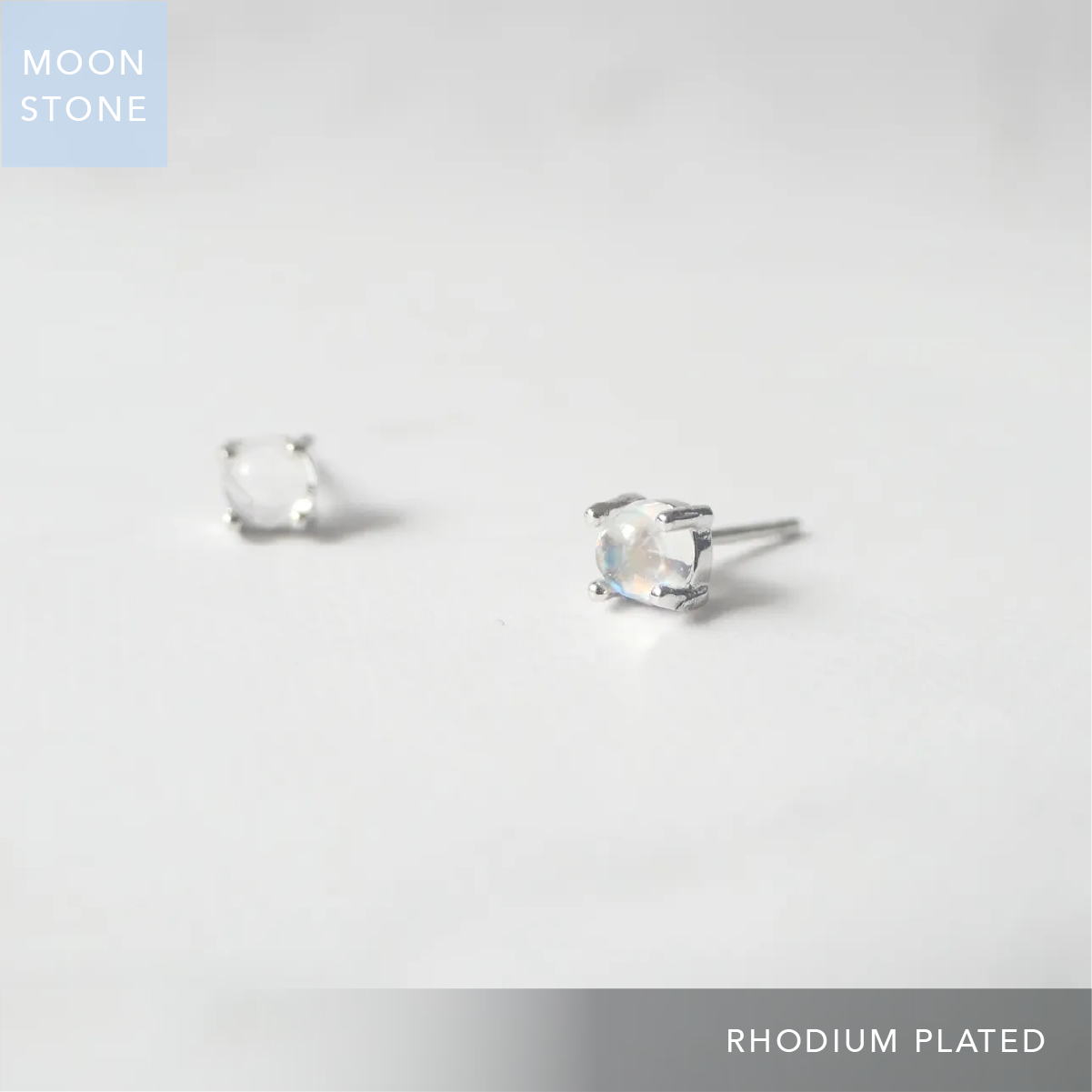 6月誕生石ムーンストーンをあしらったシルバー925ロジウムプレーティングスタッドピアス。小粒で透明感のある輝き/金属アレルギー対応。