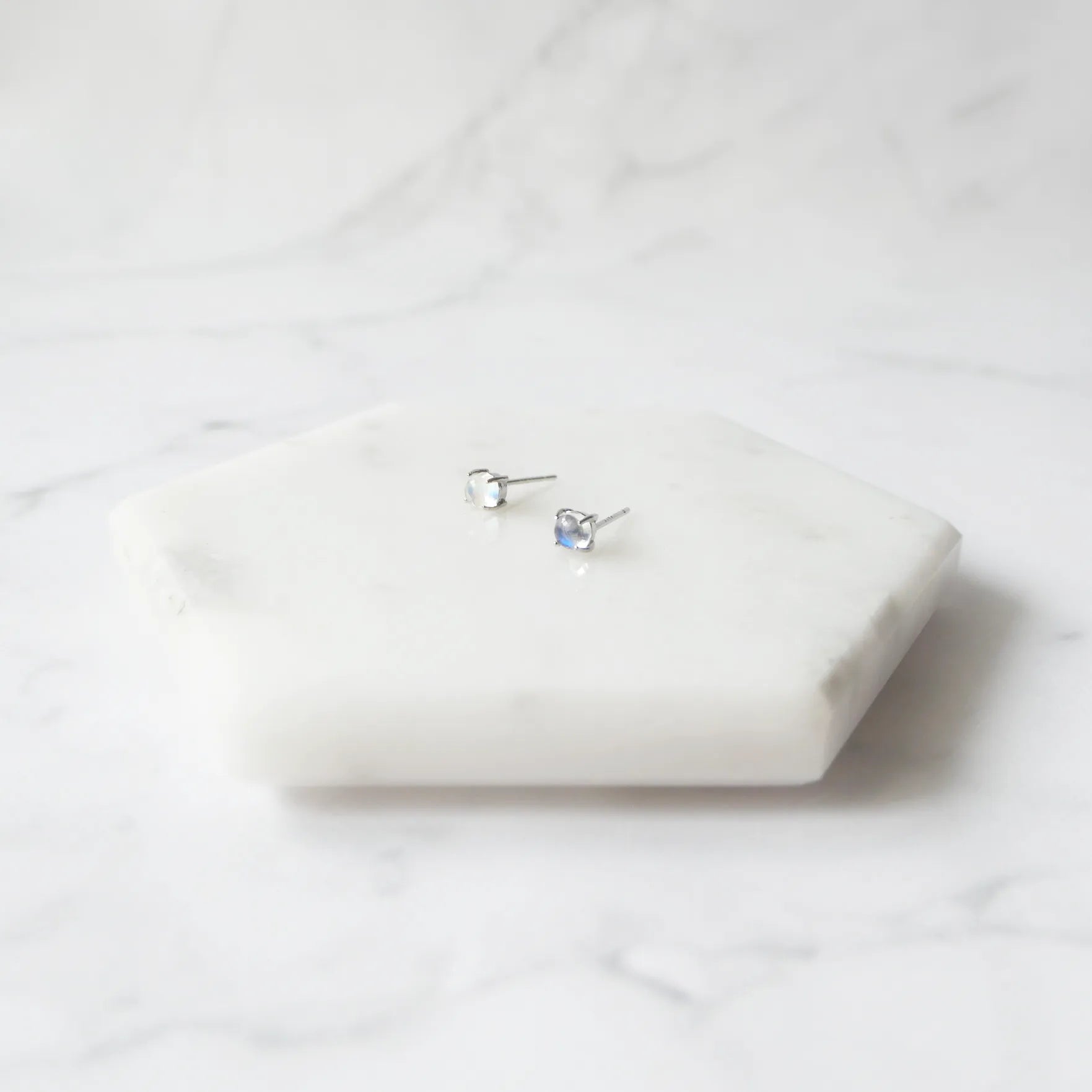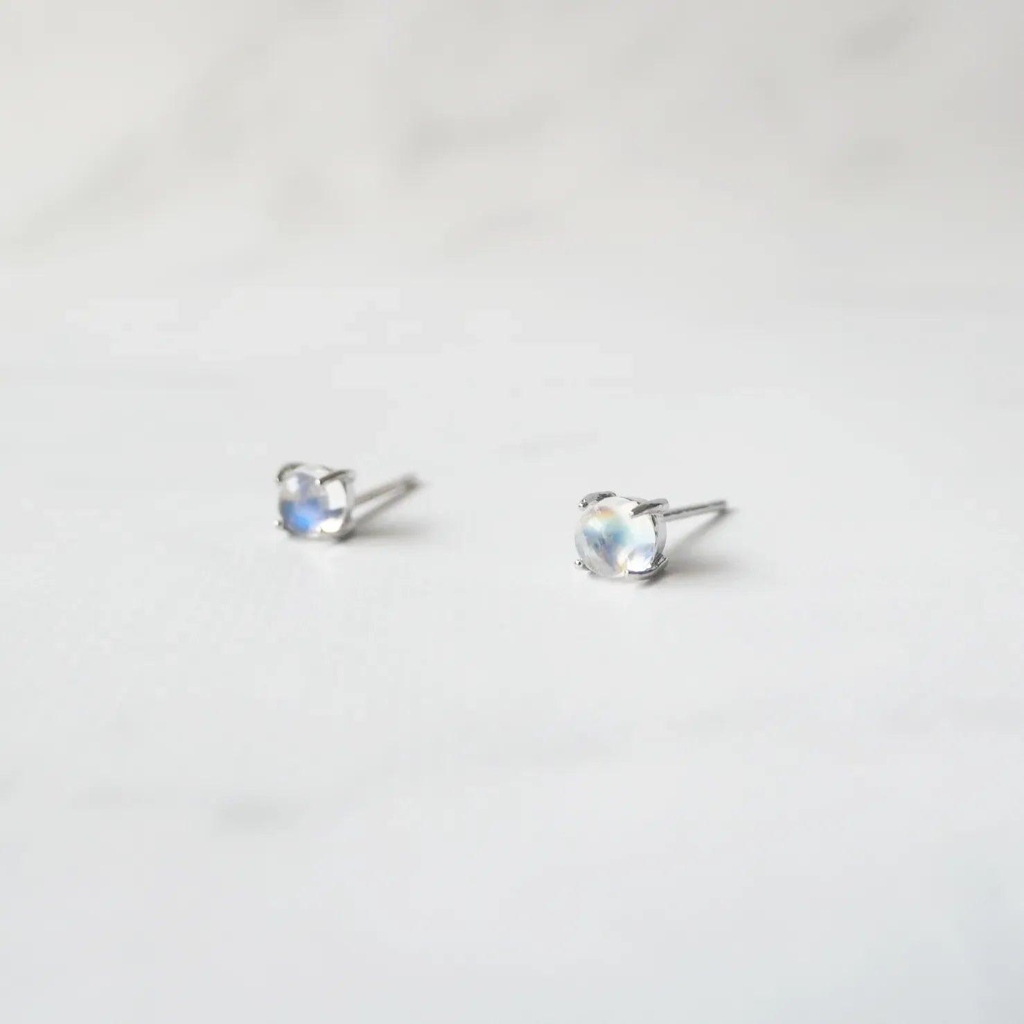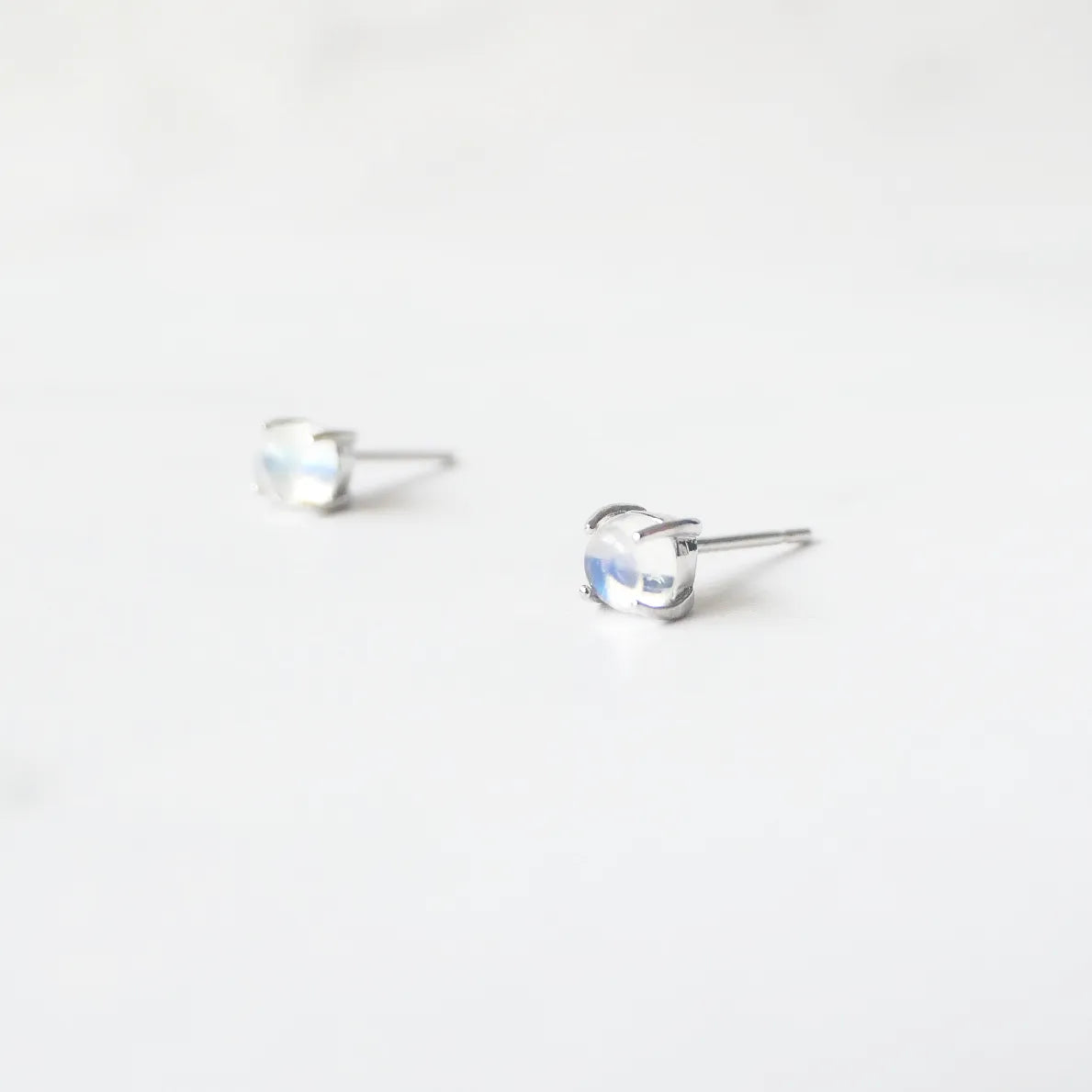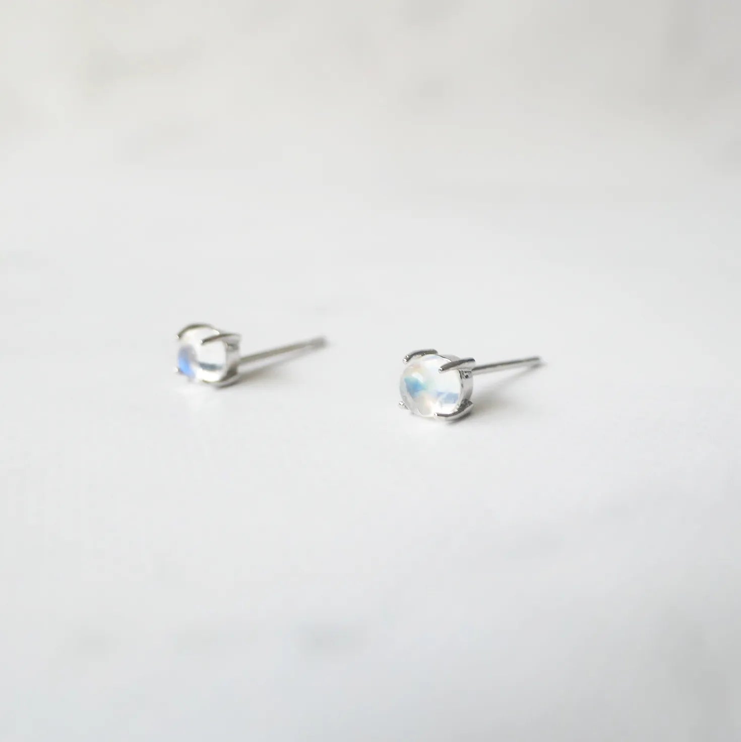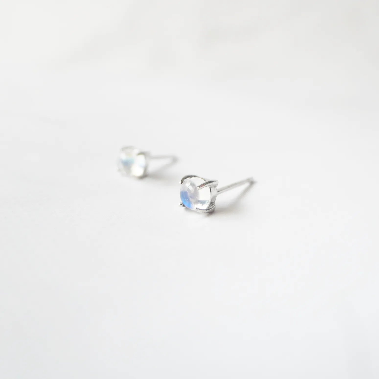 6月誕生石ムーンストーンをあしらったシルバー925ロジウムプレーティングスタッドピアス。小粒で透明感のある輝き/金属アレルギー対応。