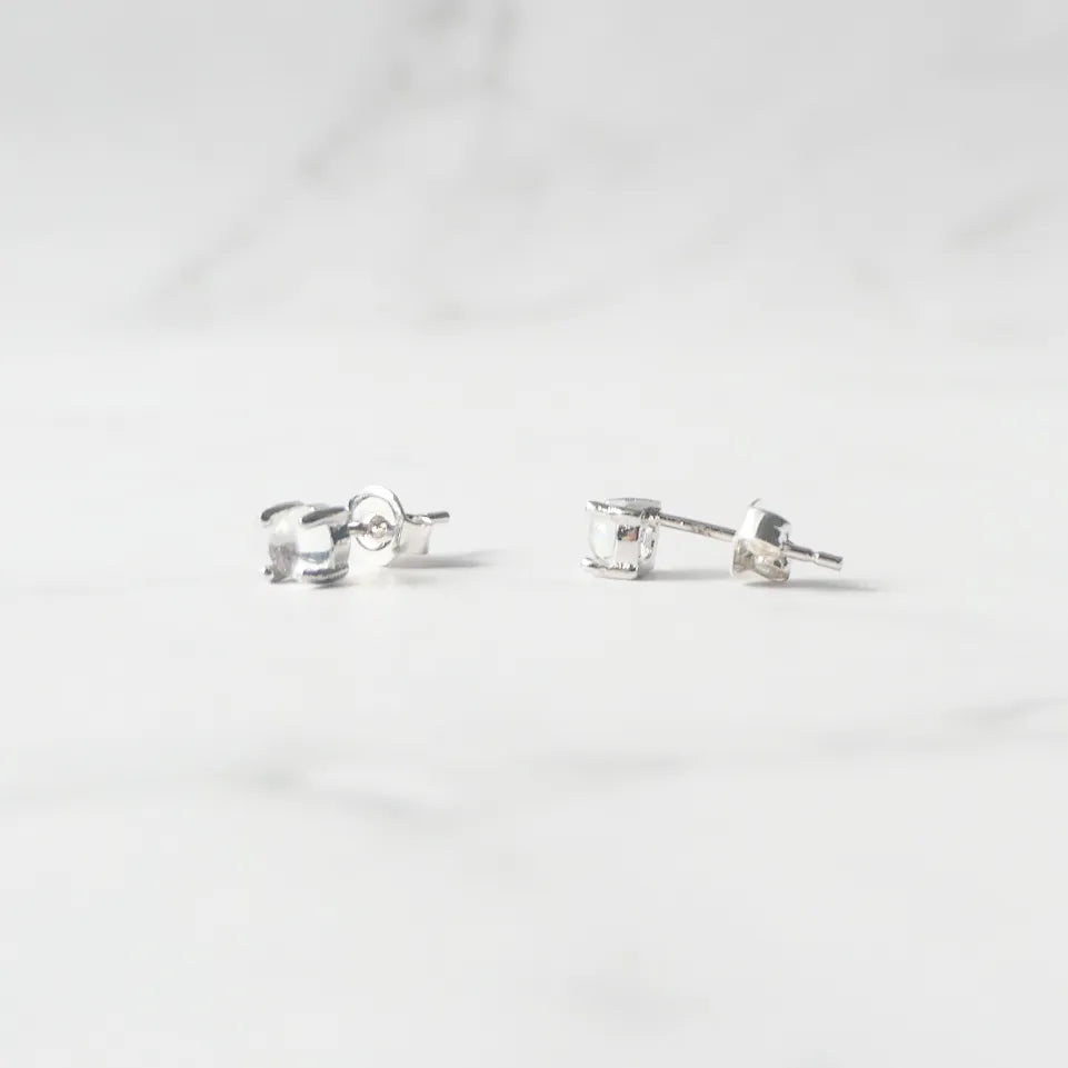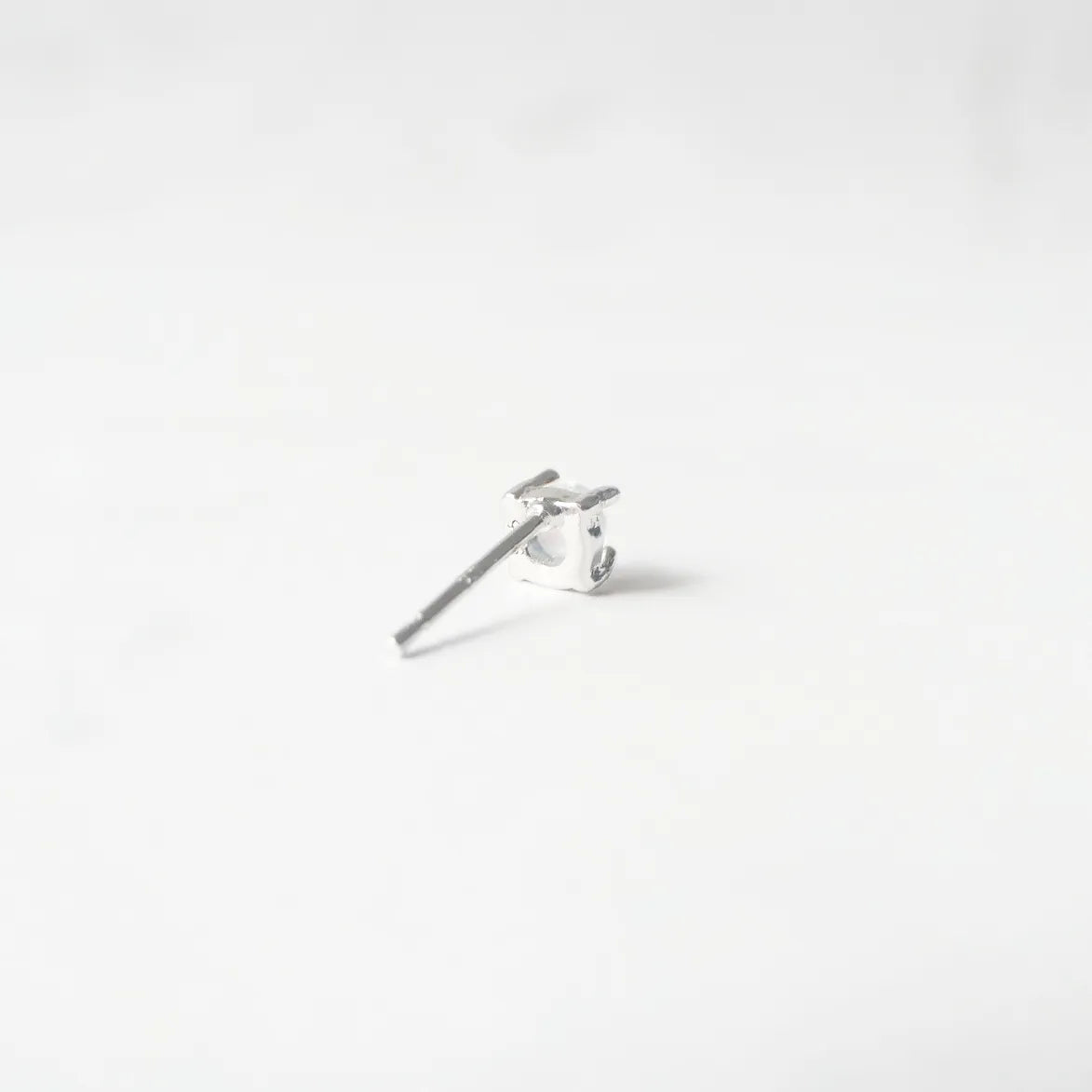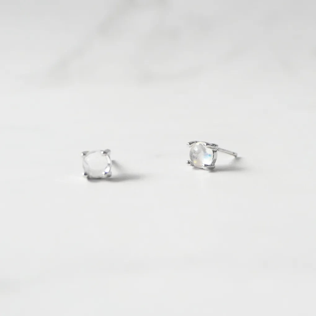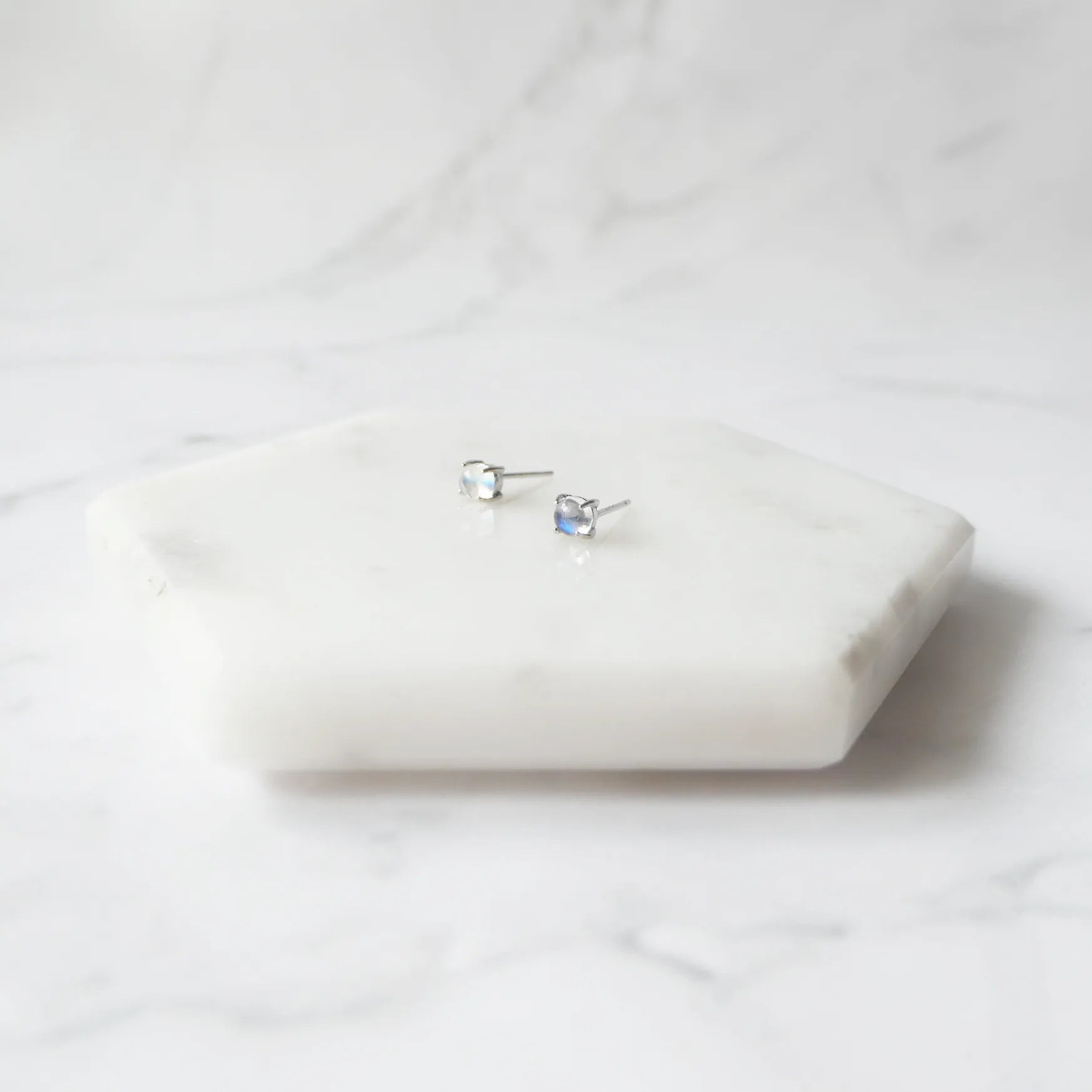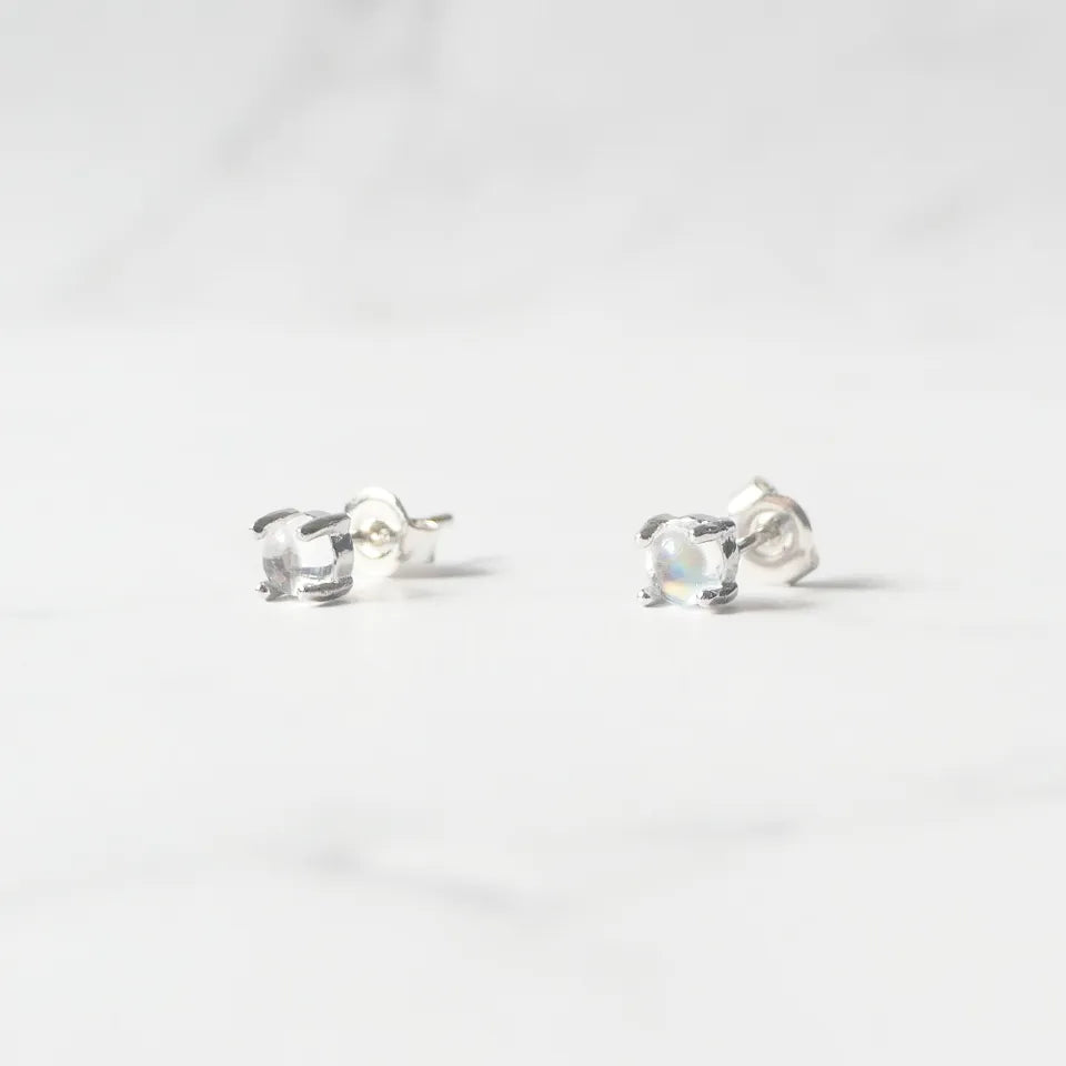 6月誕生石ムーンストーンをあしらったシルバー925ロジウムプレーティングスタッドピアス。小粒で透明感のある輝き/金属アレルギー対応。