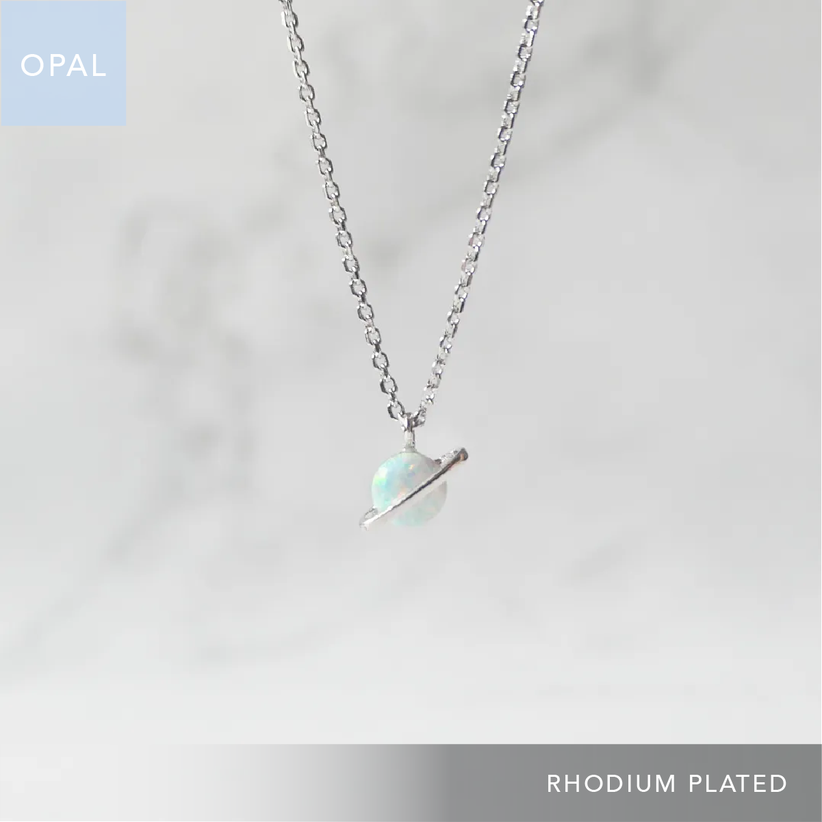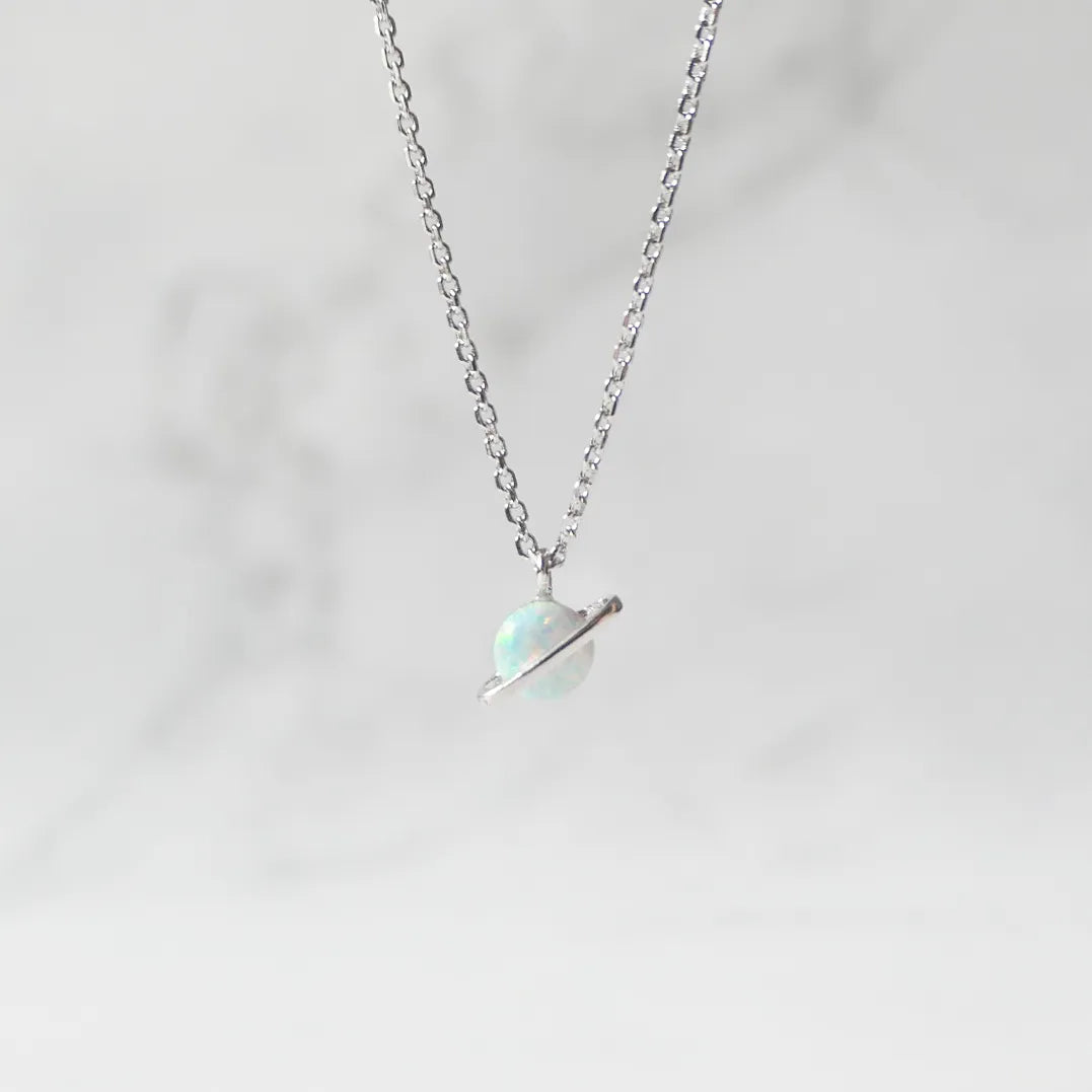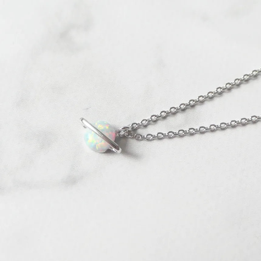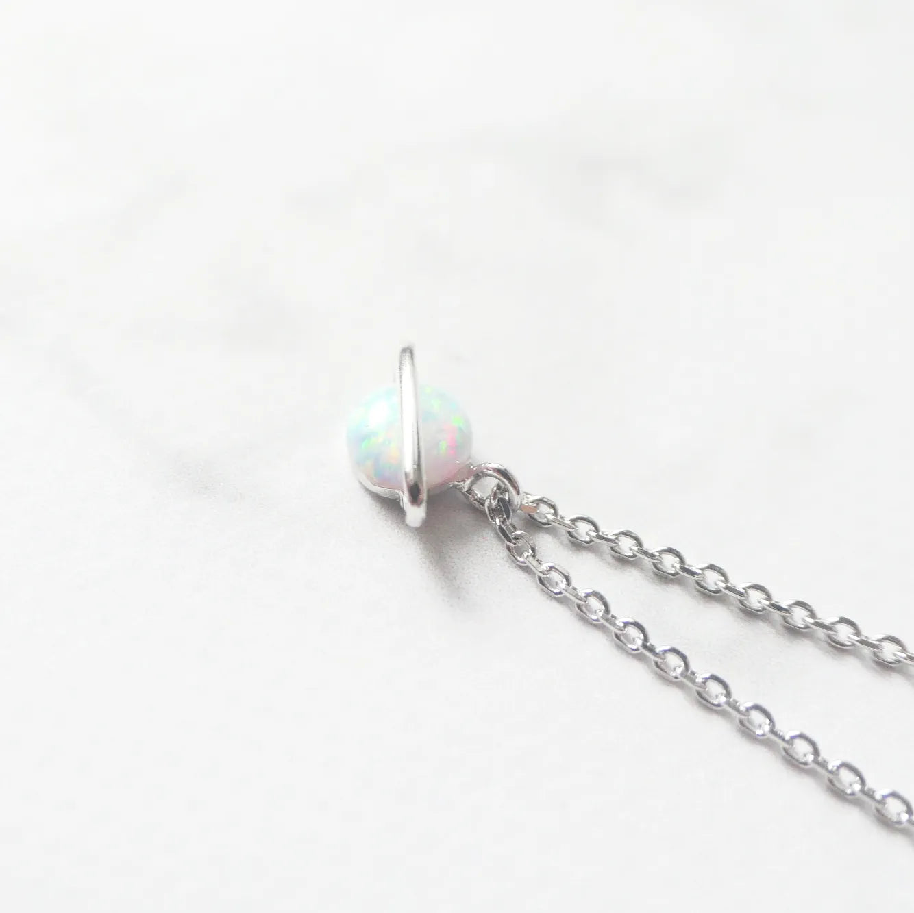 虹色の遊色効果をもつ天然オパールを惑星モチーフにセットしたシルバーネックレス。太陽の光が海に反射して生まれる儚く繊細なきらめきを、オパール特有の色彩変化で表現しました。