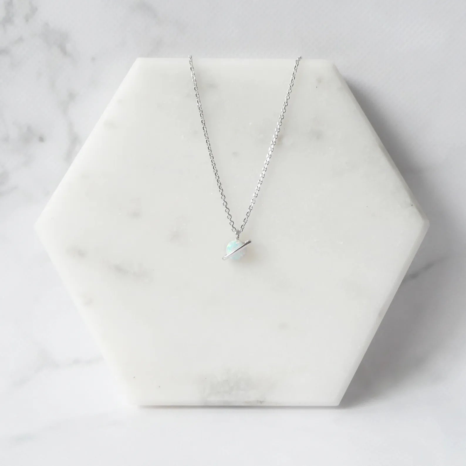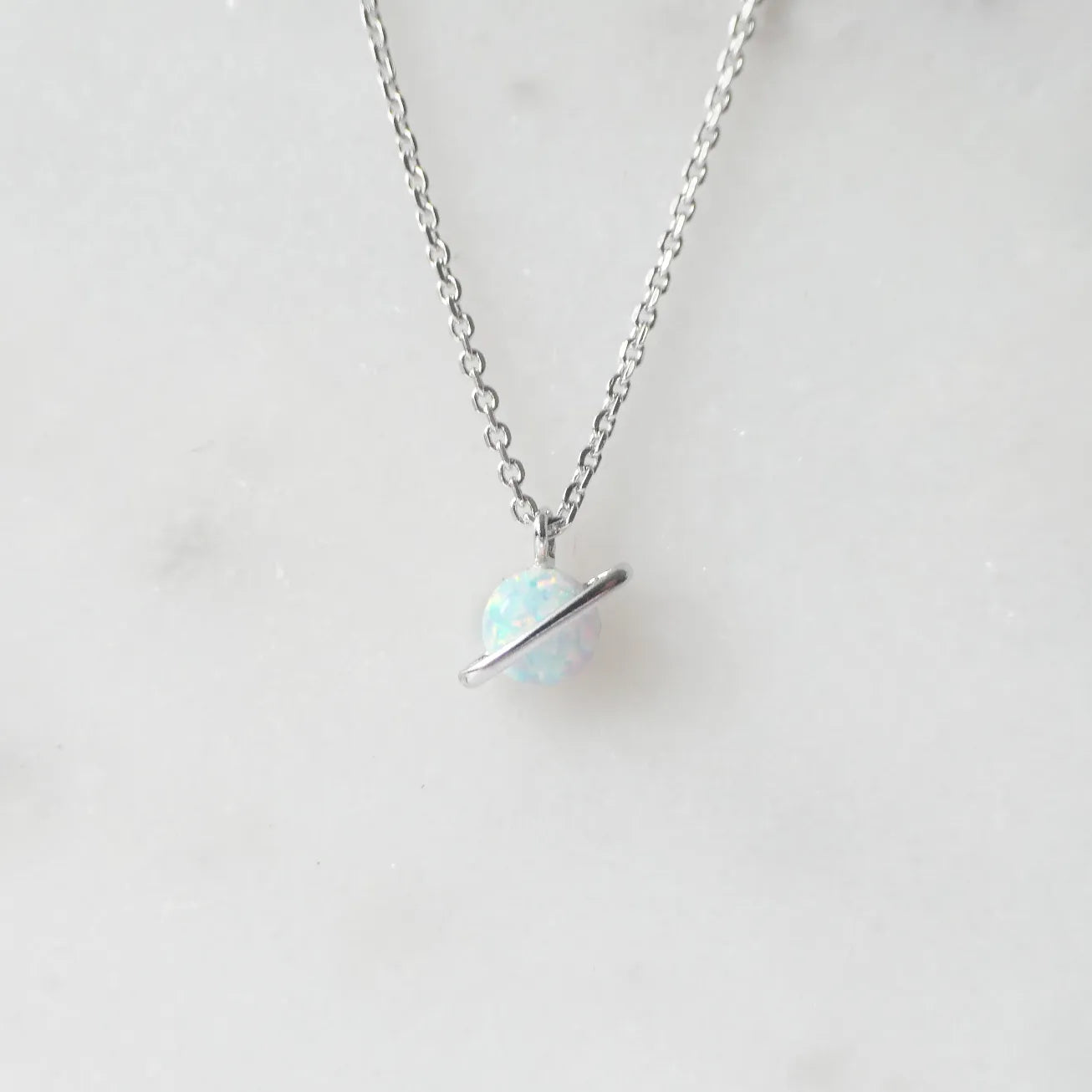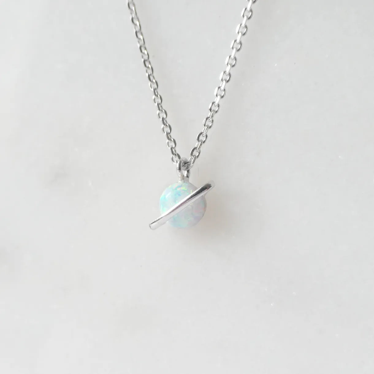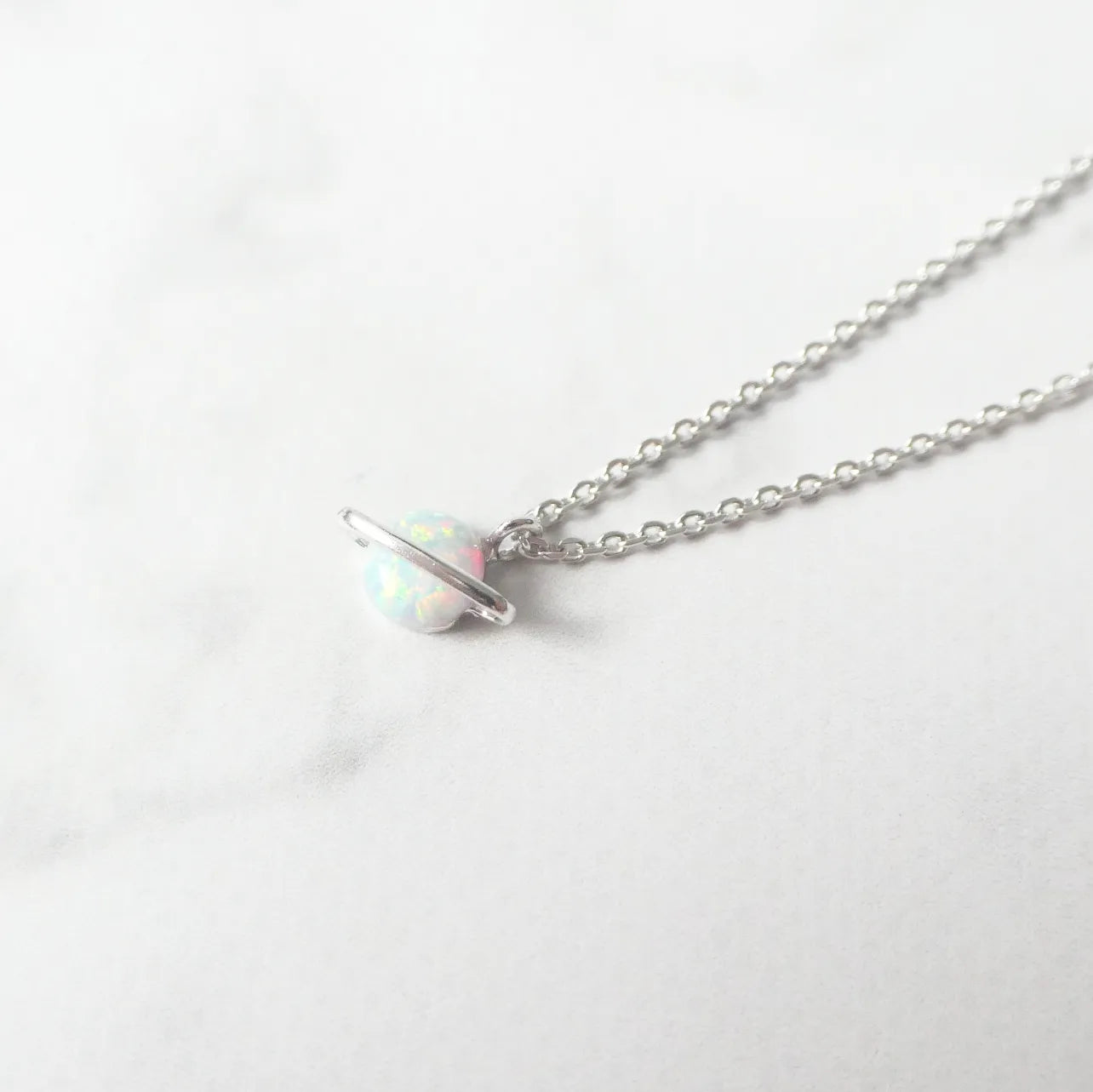 虹色の遊色効果をもつ天然オパールを惑星モチーフにセットしたシルバーネックレス。太陽の光が海に反射して生まれる儚く繊細なきらめきを、オパール特有の色彩変化で表現しました。