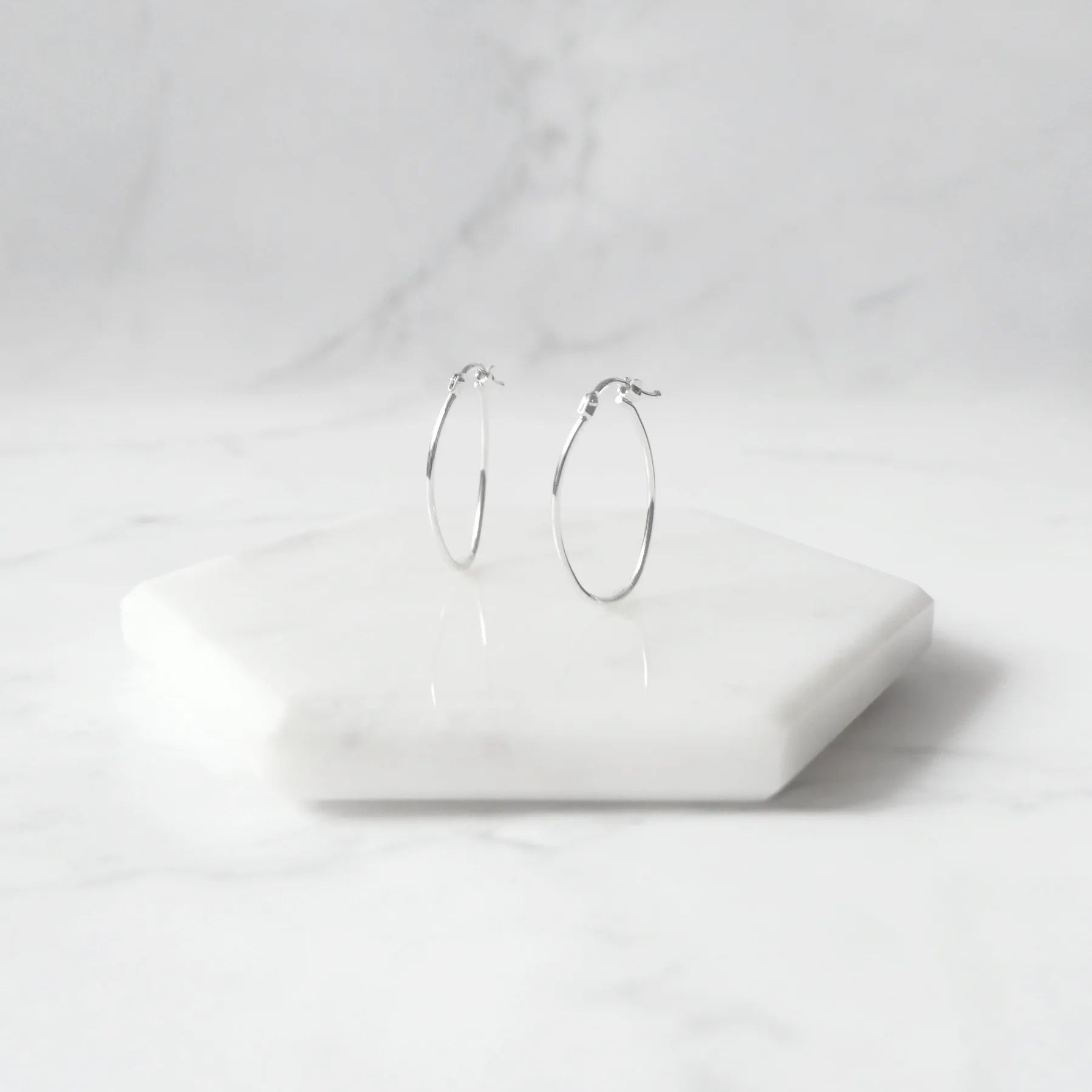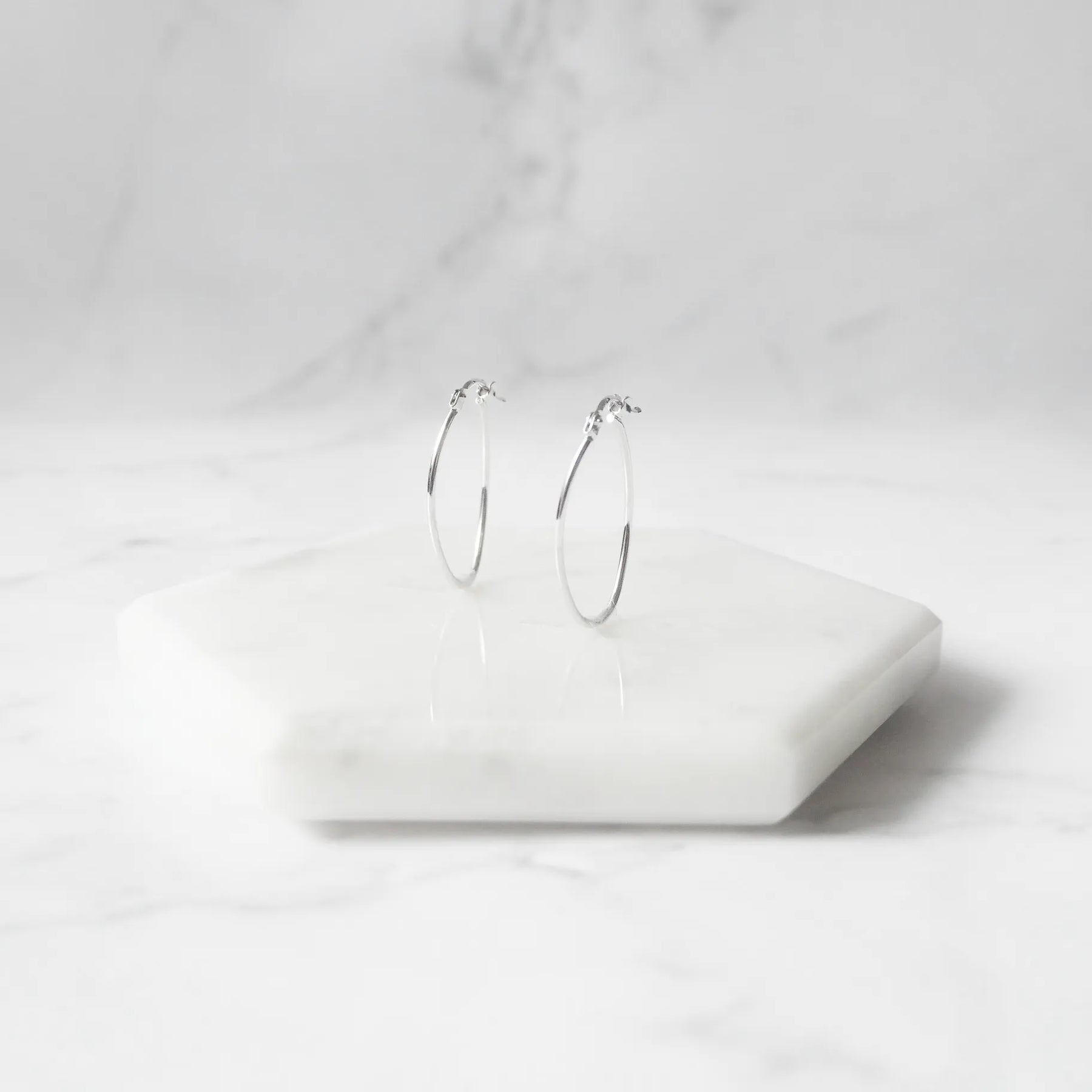 ひと筆書きのようなシンプルな線で構成された、楕円型のフープピアス。スターリングシルバー(シルバー925)の素材感をそのまま活かした、装飾を抑えたミニマルなデザインが特徴です。やや大きめのサイズ感で、さりげない存在感を耳元に添えます。無駄のない美しさが、カジュアルにもモードにも自然に溶け込む一品です。