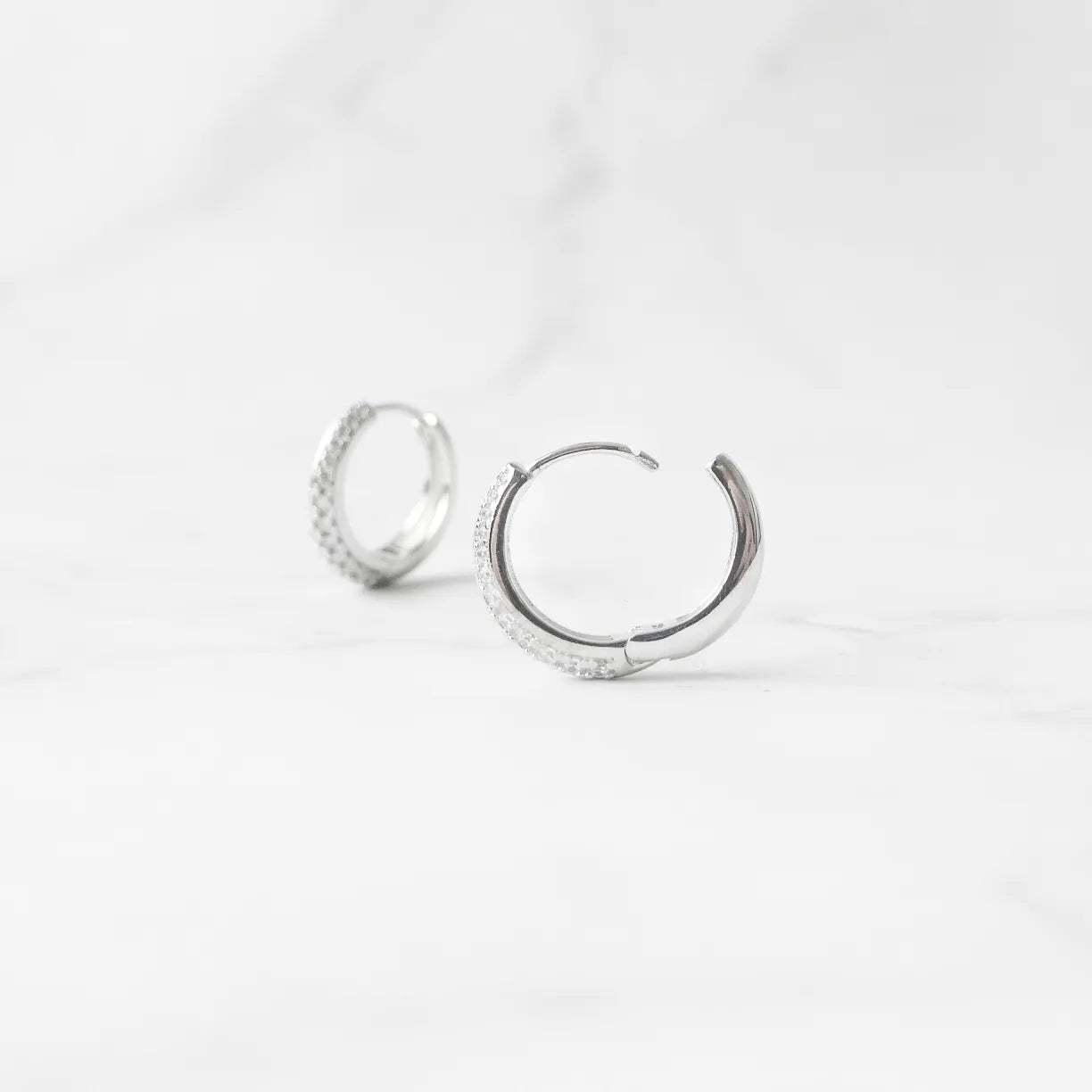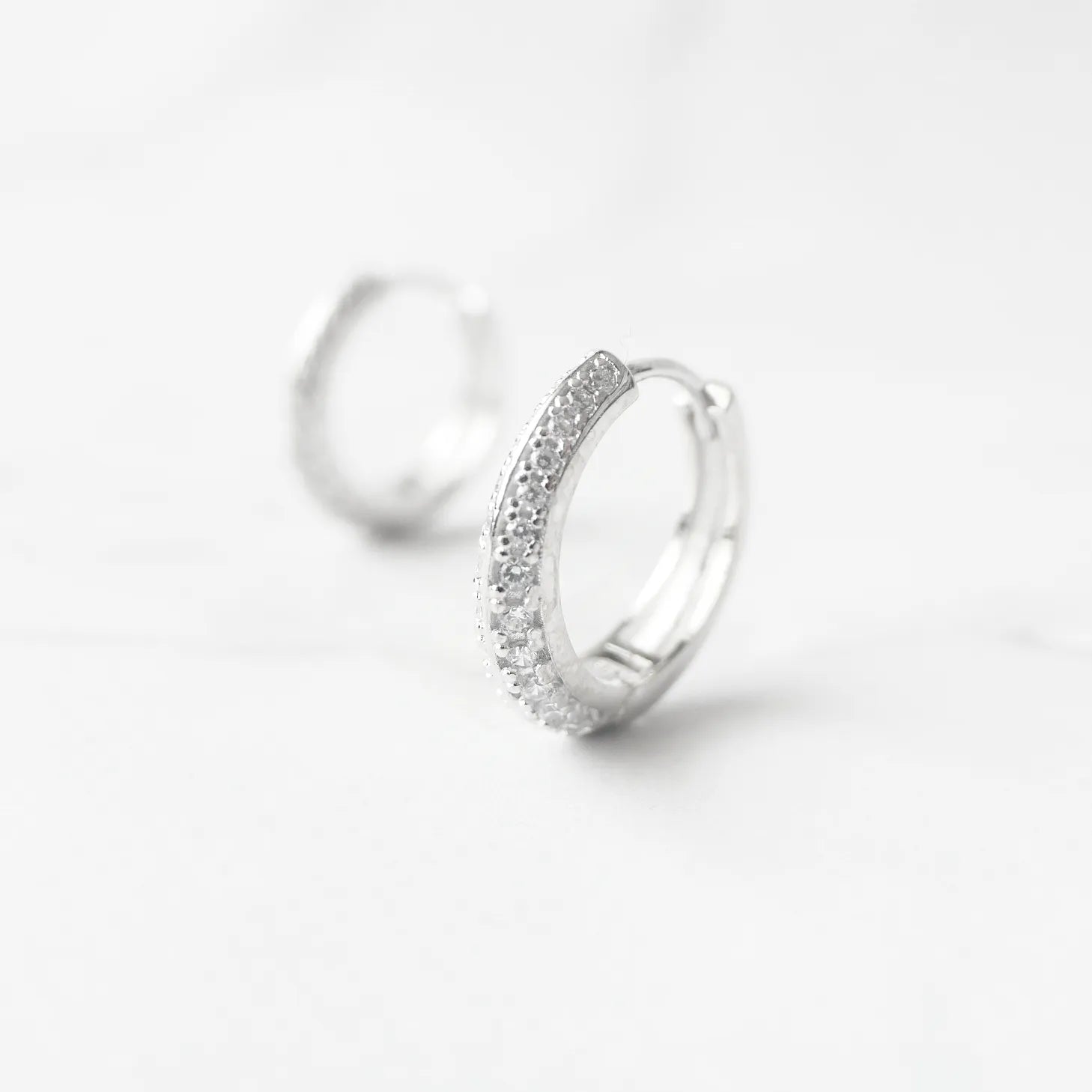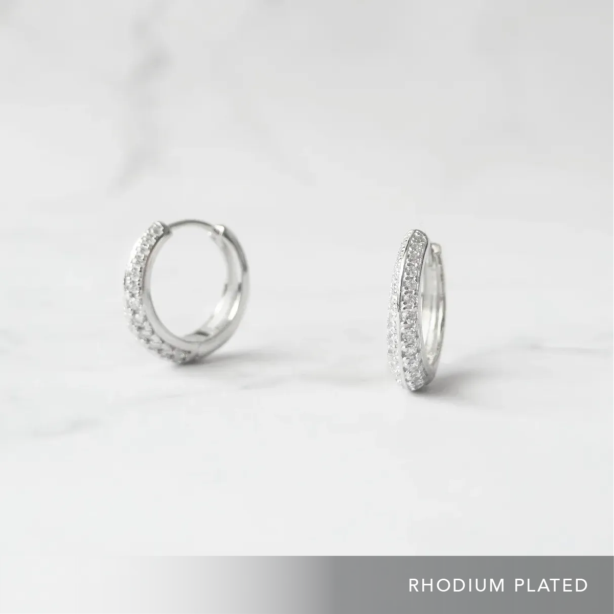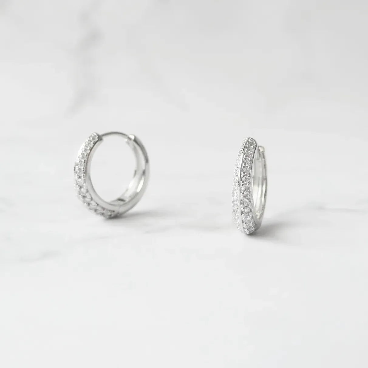 小粒のジルコニアをフロント部分に一列に敷き詰め、耳元に華やかな輝きを添えるフープスタイルピアス。直径1.5cmのコンパクトなサイズ感ながら、光を反射する細やかなきらめきで存在感を放ちます。