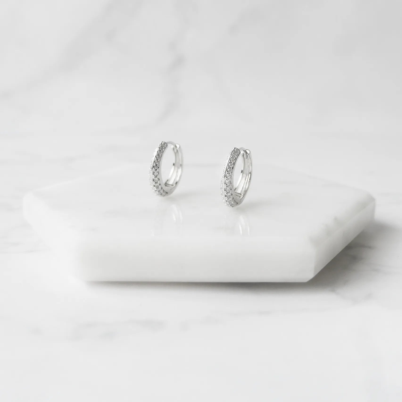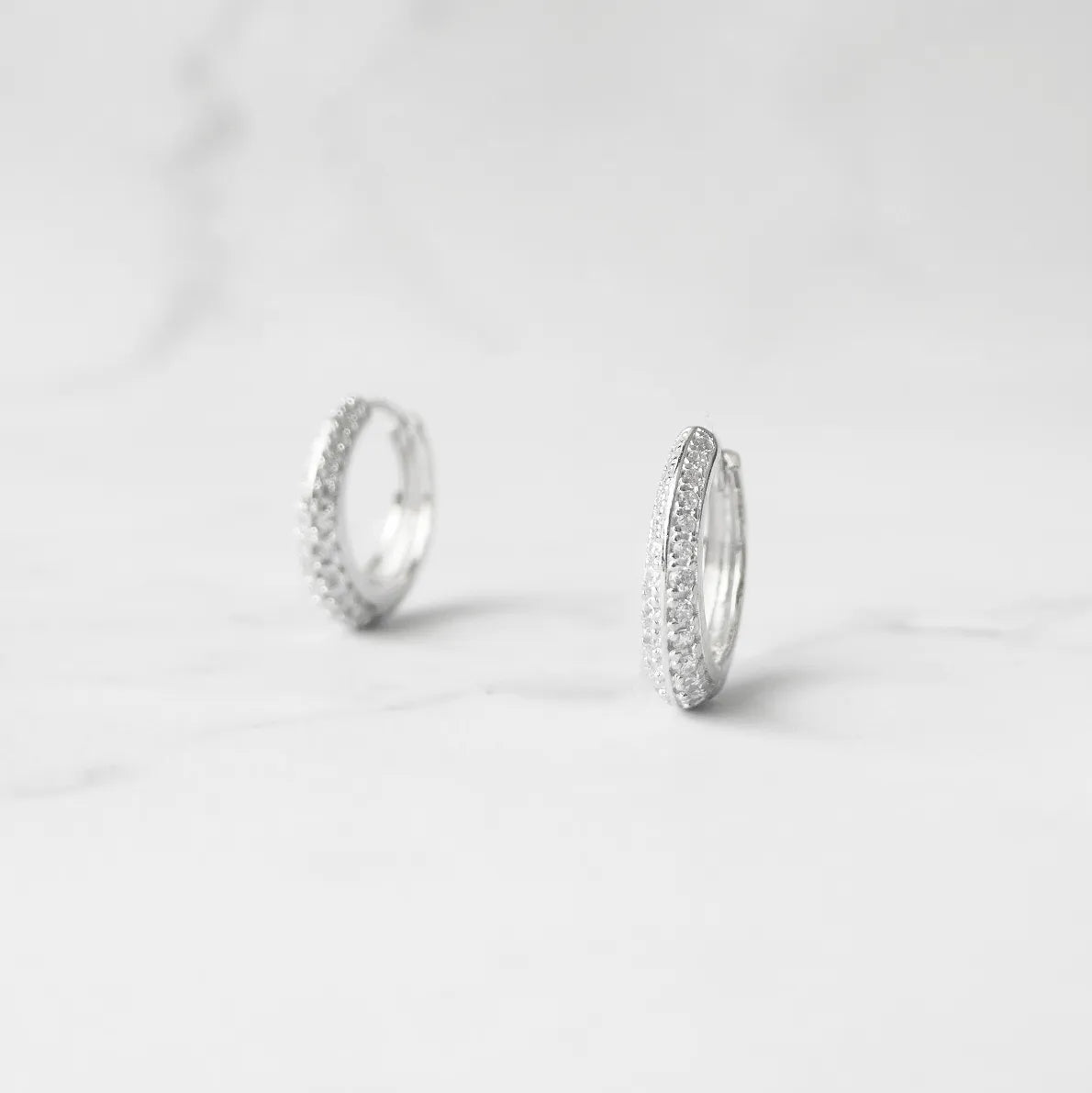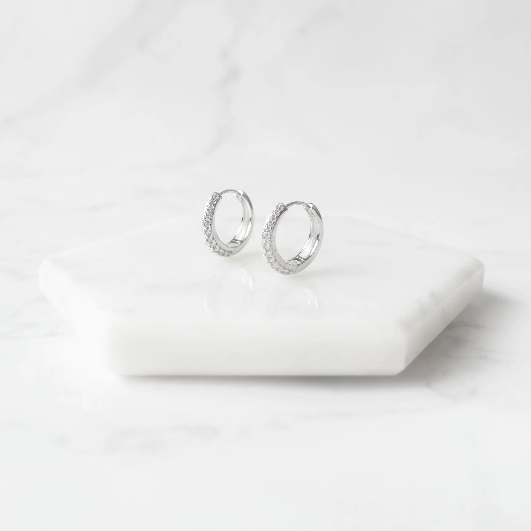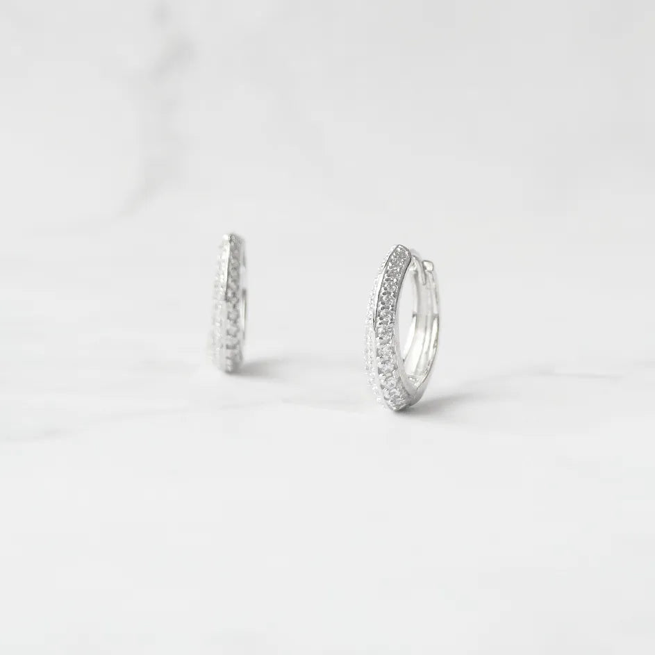 小粒のジルコニアをフロント部分に一列に敷き詰め、耳元に華やかな輝きを添えるフープスタイルピアス。直径1.5cmのコンパクトなサイズ感ながら、光を反射する細やかなきらめきで存在感を放ちます。
