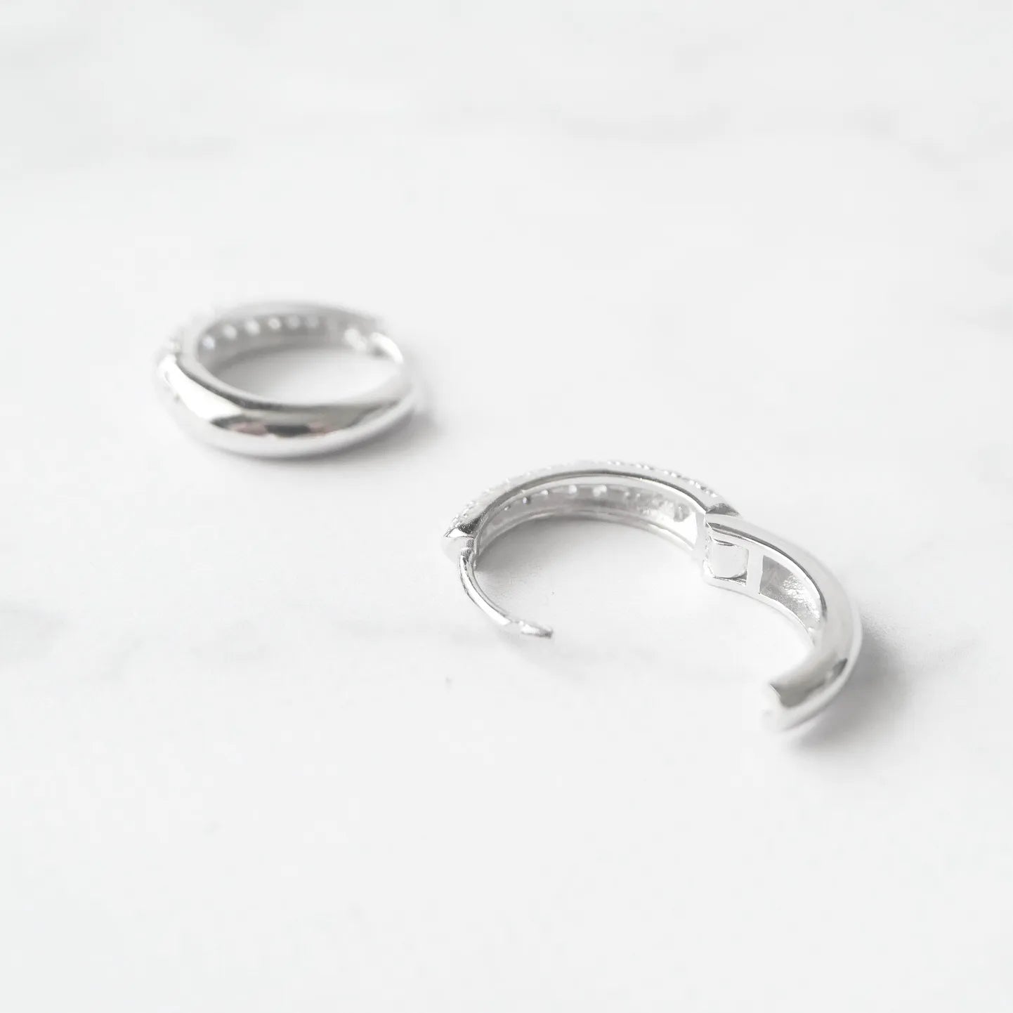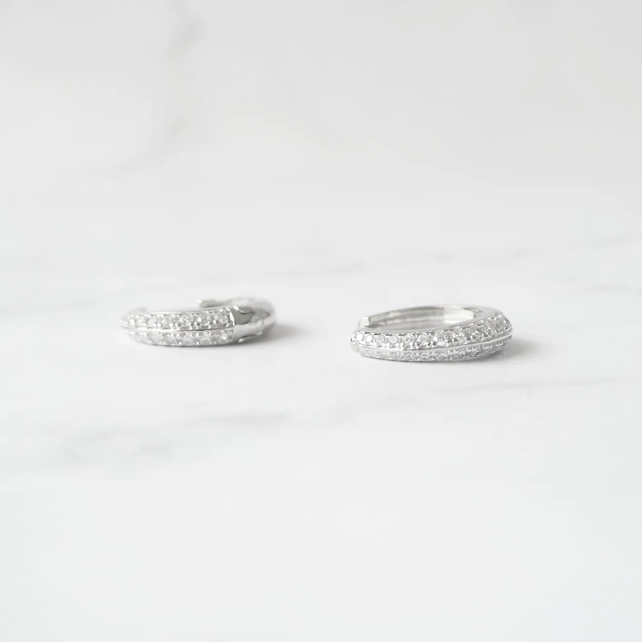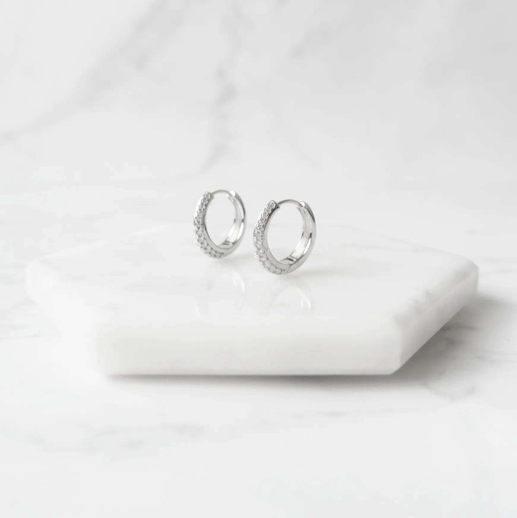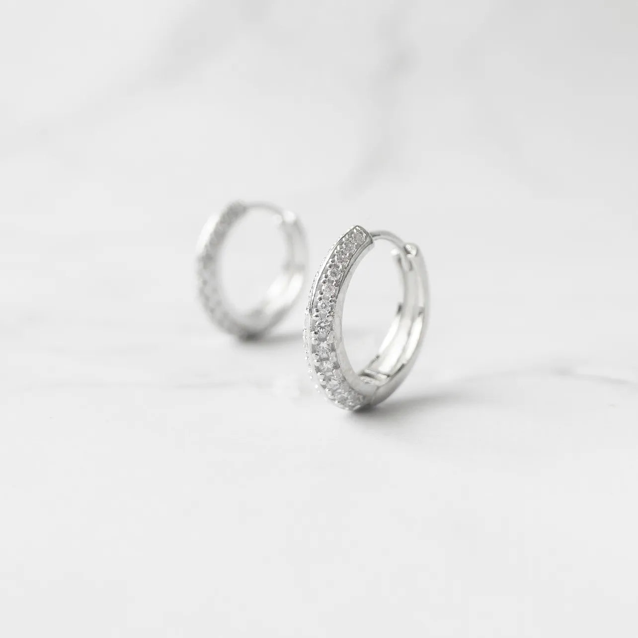 小粒のジルコニアをフロント部分に一列に敷き詰め、耳元に華やかな輝きを添えるフープスタイルピアス。直径1.5cmのコンパクトなサイズ感ながら、光を反射する細やかなきらめきで存在感を放ちます。