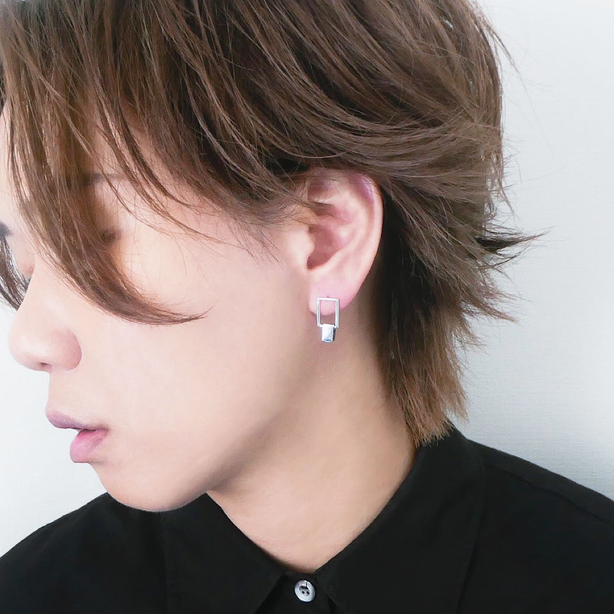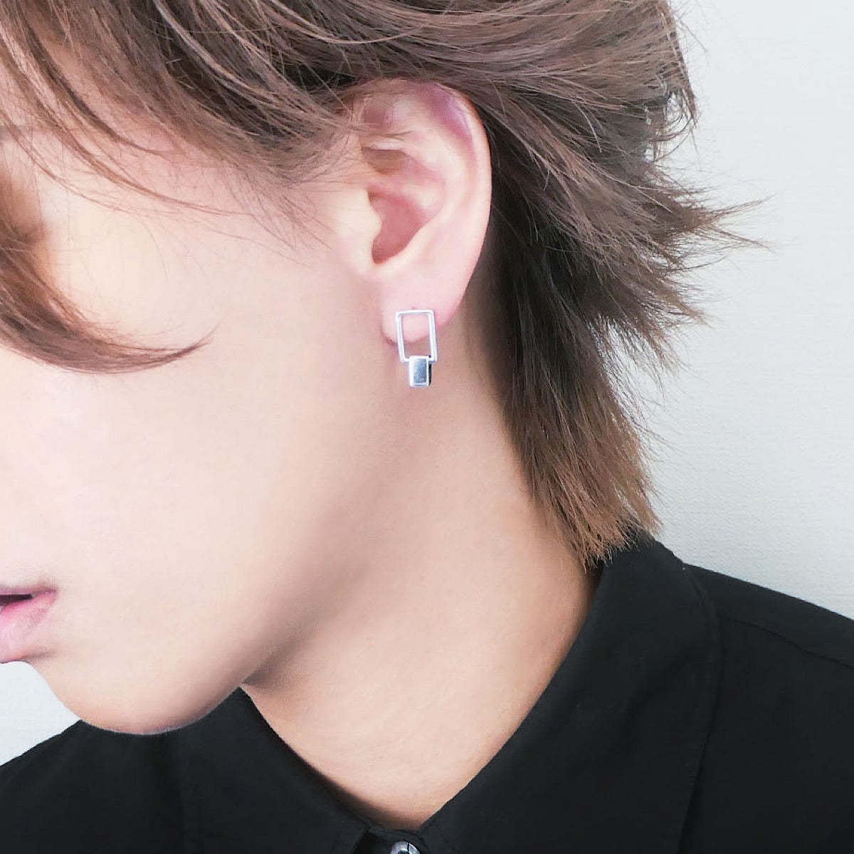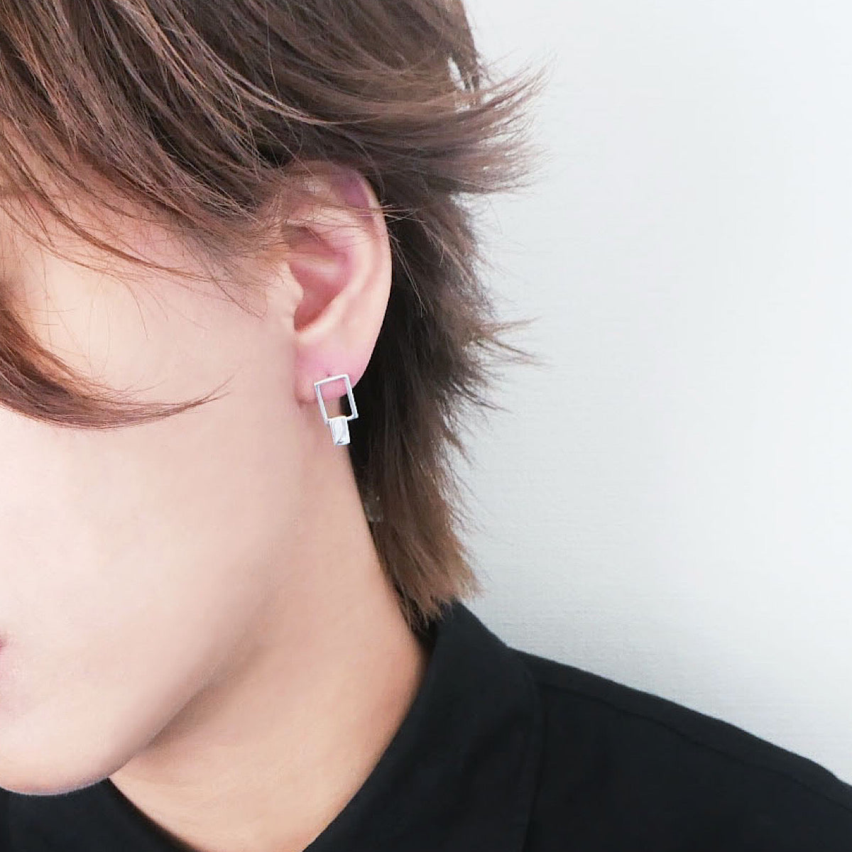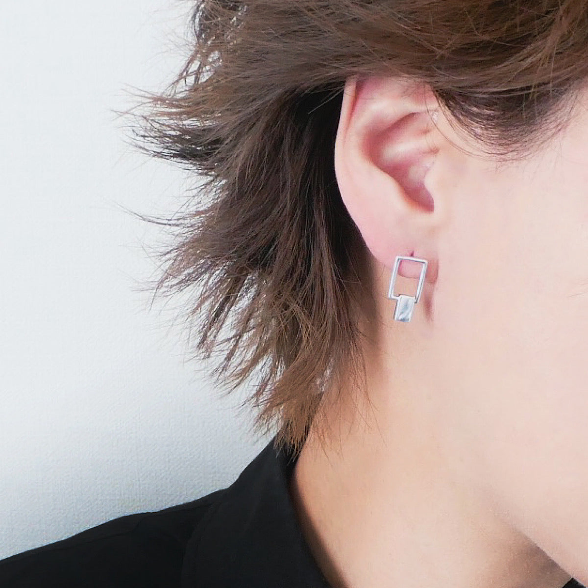 シャープな印象のオープンスクエアに、小さな純銀キューブが揺れるデザインが印象的な、スタッドタイプのダングルピアス。動きに合わせてキューブが軽やかに揺れ、耳元にさりげないアクセントとリズムを与えてくれます。ミニマルながらも遊び心のあるデザインで、日常使いからモードな装いまで幅広く活躍する一品です。