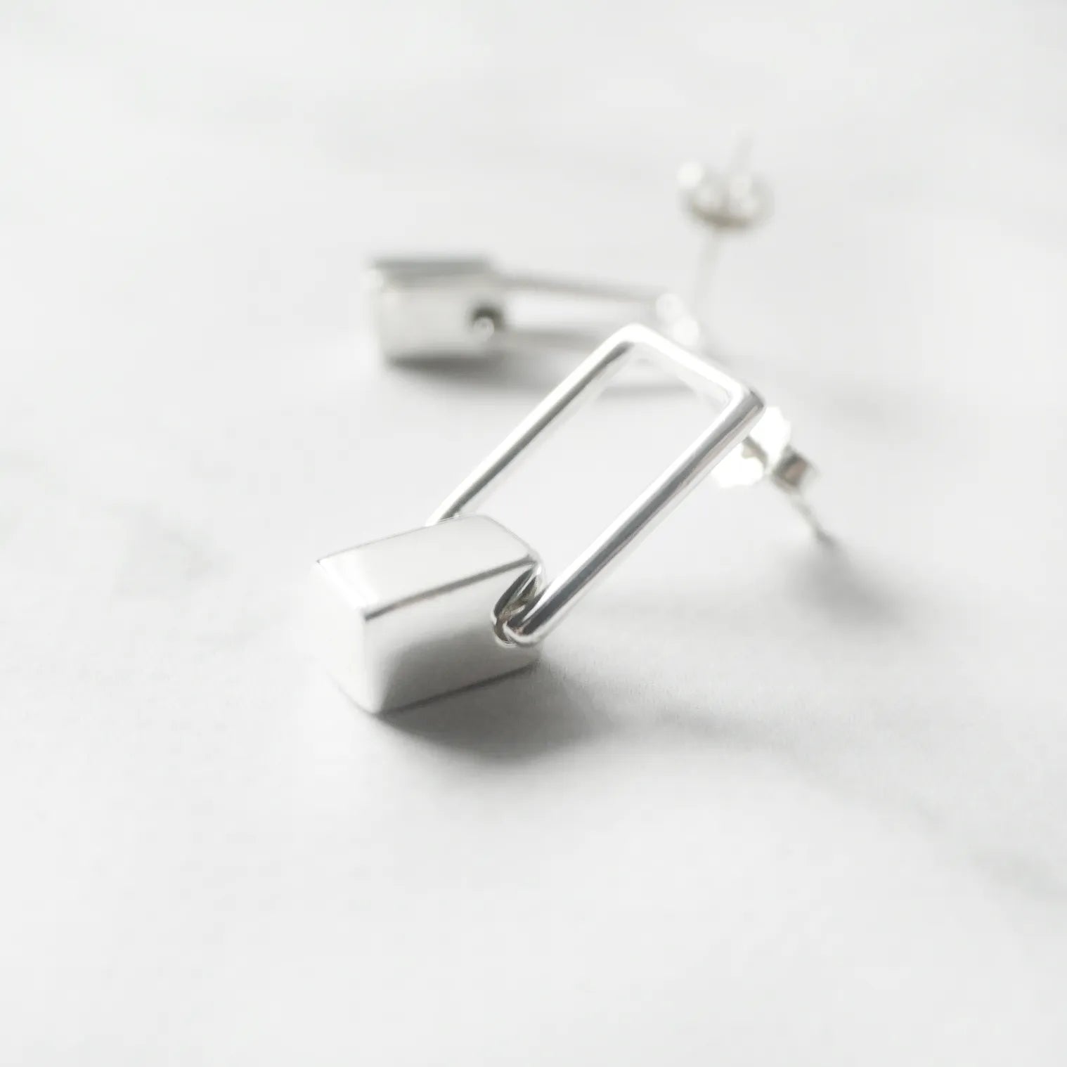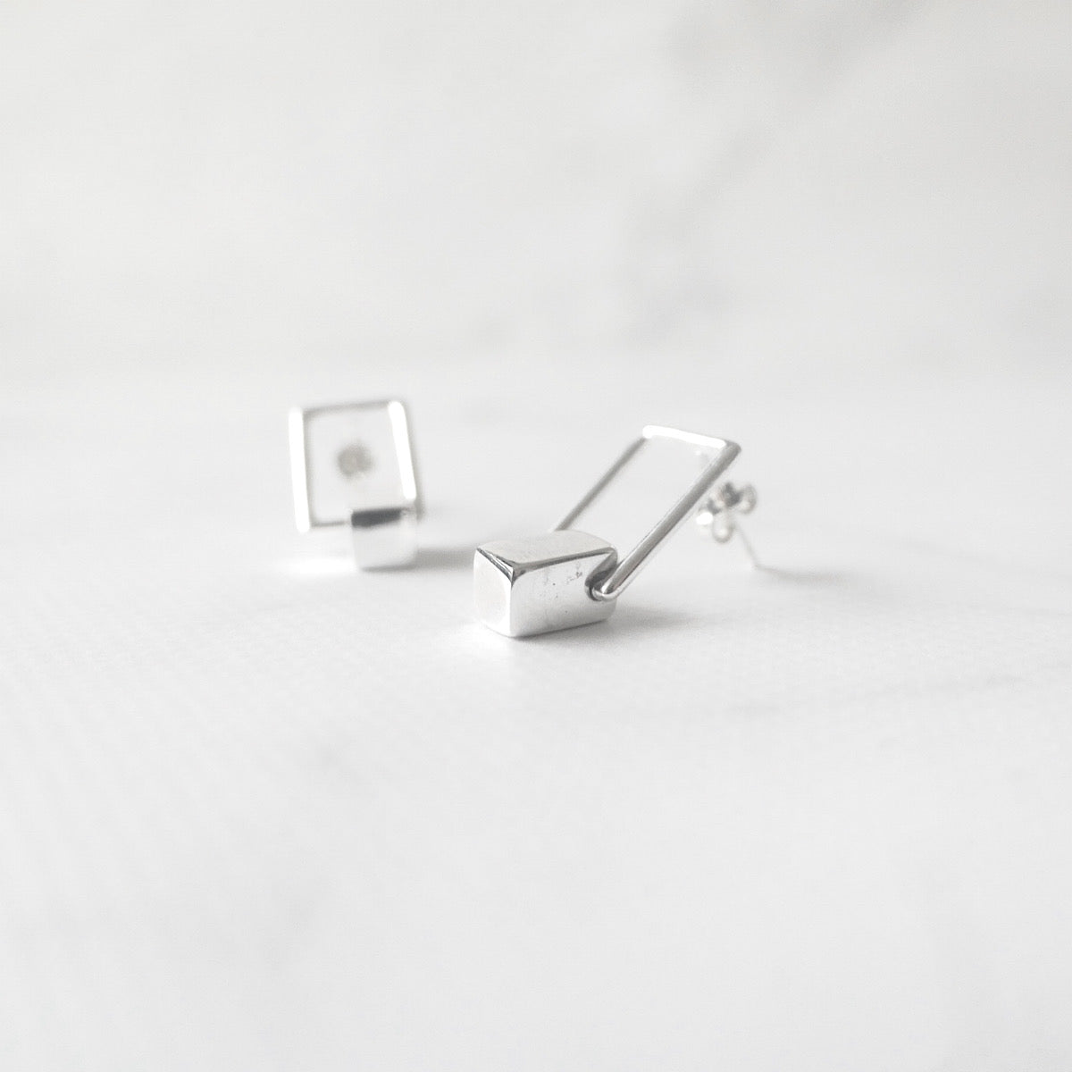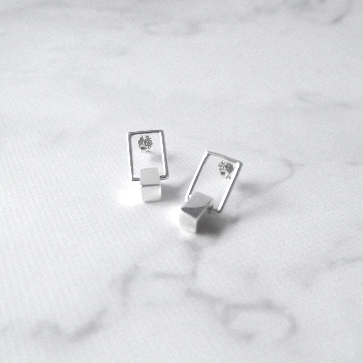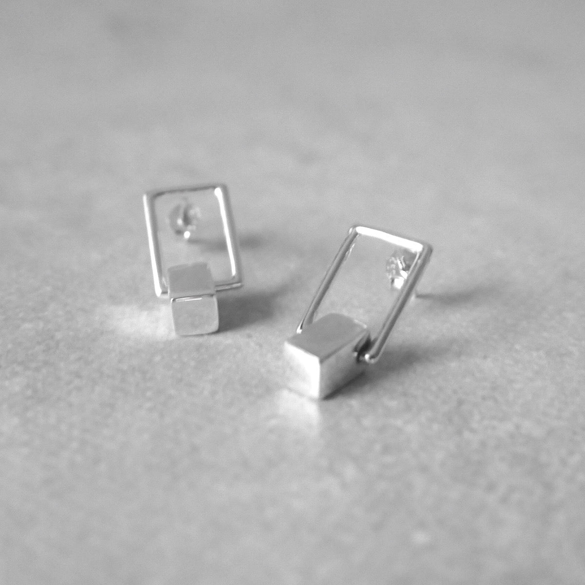 シャープな印象のオープンスクエアに、小さな純銀キューブが揺れるデザインが印象的な、スタッドタイプのダングルピアス。動きに合わせてキューブが軽やかに揺れ、耳元にさりげないアクセントとリズムを与えてくれます。ミニマルながらも遊び心のあるデザインで、日常使いからモードな装いまで幅広く活躍する一品です。