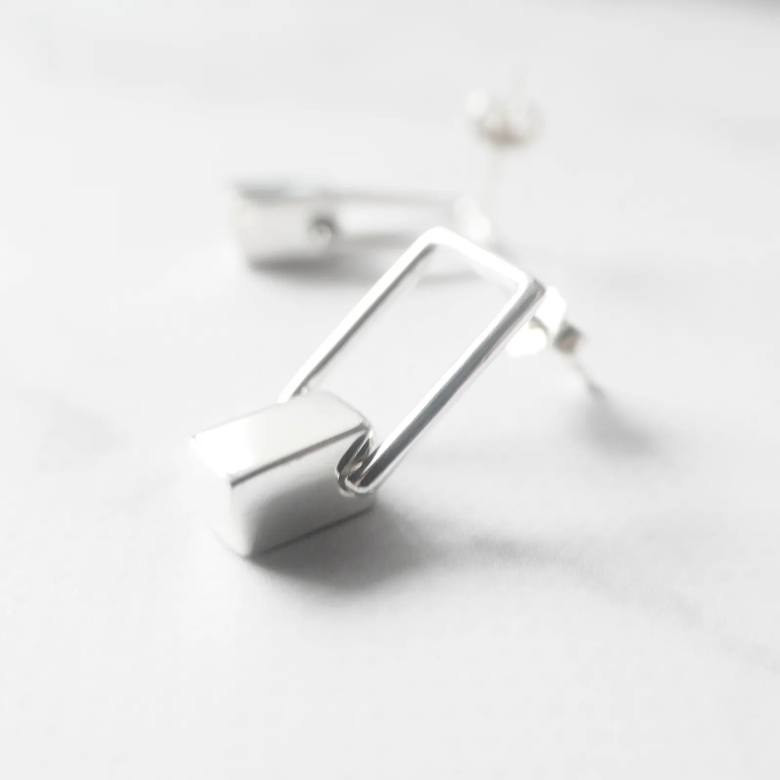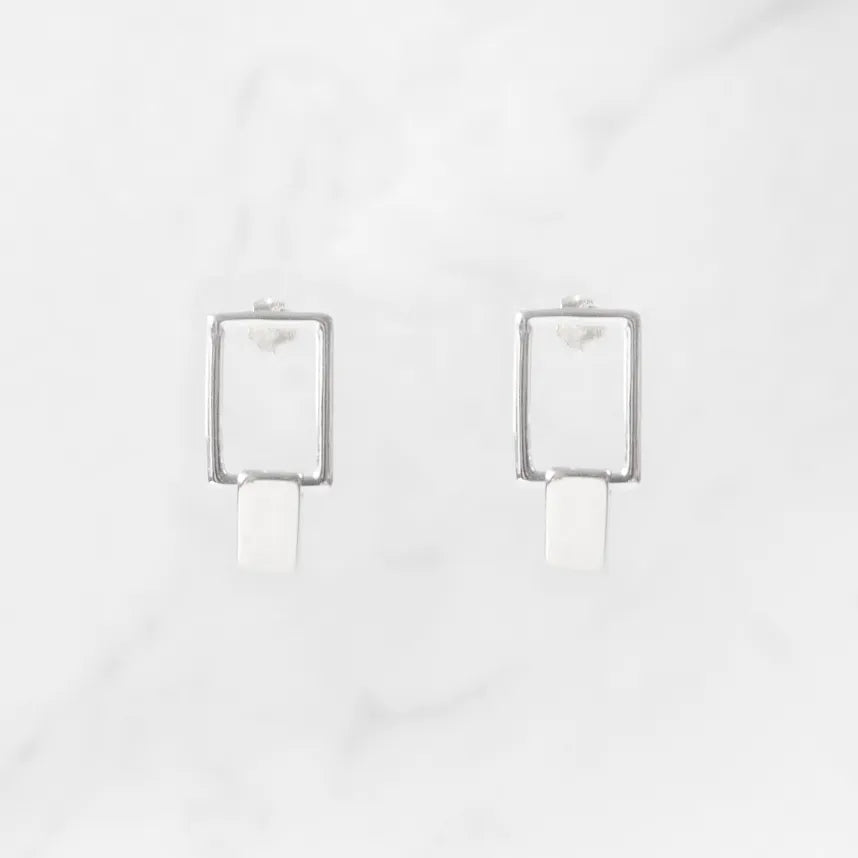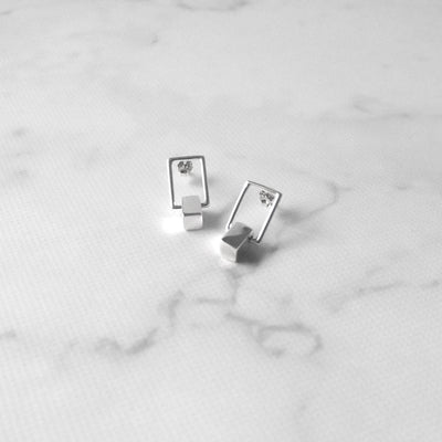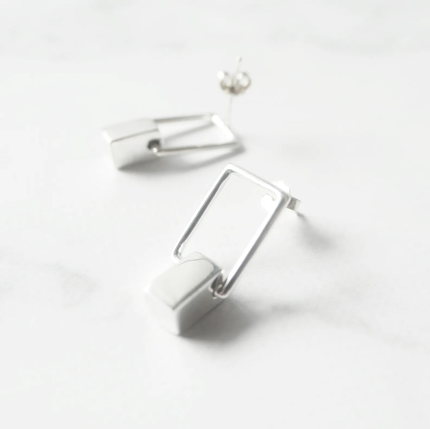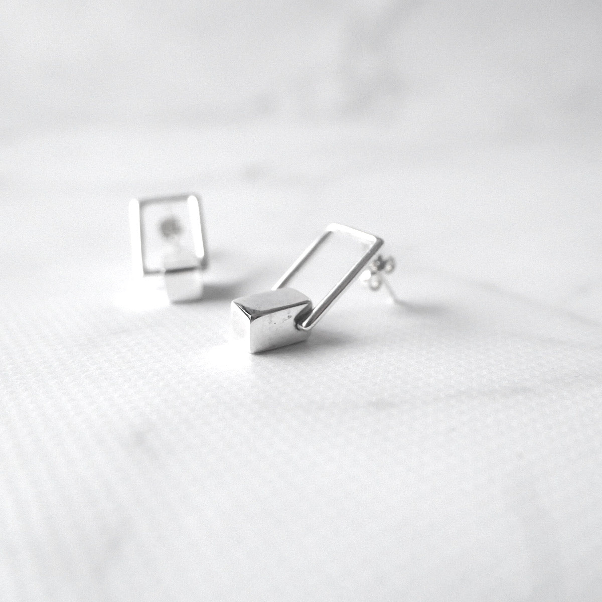 シャープな印象のオープンスクエアに、小さな純銀キューブが揺れるデザインが印象的な、スタッドタイプのダングルピアス。動きに合わせてキューブが軽やかに揺れ、耳元にさりげないアクセントとリズムを与えてくれます。ミニマルながらも遊び心のあるデザインで、日常使いからモードな装いまで幅広く活躍する一品です。